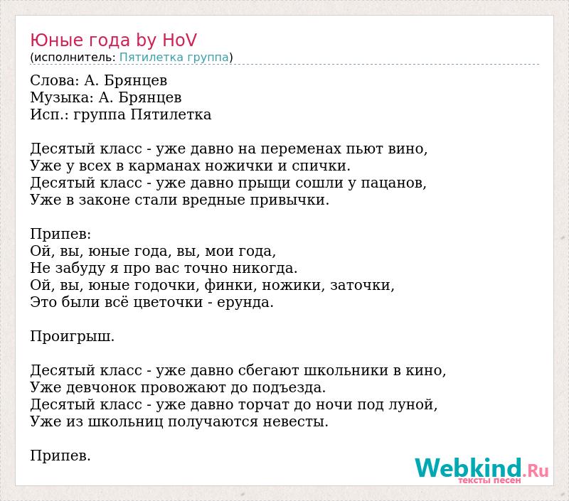 Слова: А. Брянцев Музыка: А. Брянцев Исп.: группа Пятилетка Десятый класс - уже давно на переменах пьют вино, Уже у всех в карманах ножички и спички. Десятый класс - уже давно прыщи сошли у пацанов, Уже в законе стали вредные привычки. Припев: Ой, вы, юные года, вы, мои года, Не забуду я про вас точно никогда. Ой, вы, юные годочки, финки, ножики, заточки, Это были всё цветочки - ерунда. Проигрыш. Десятый класс - уже давно сбегают школьники в кино, Уже девчонок провожают до подъезда. Десятый класс - уже давно торчат до ночи под луной, Уже из школьниц получаются невесты. Припев.
