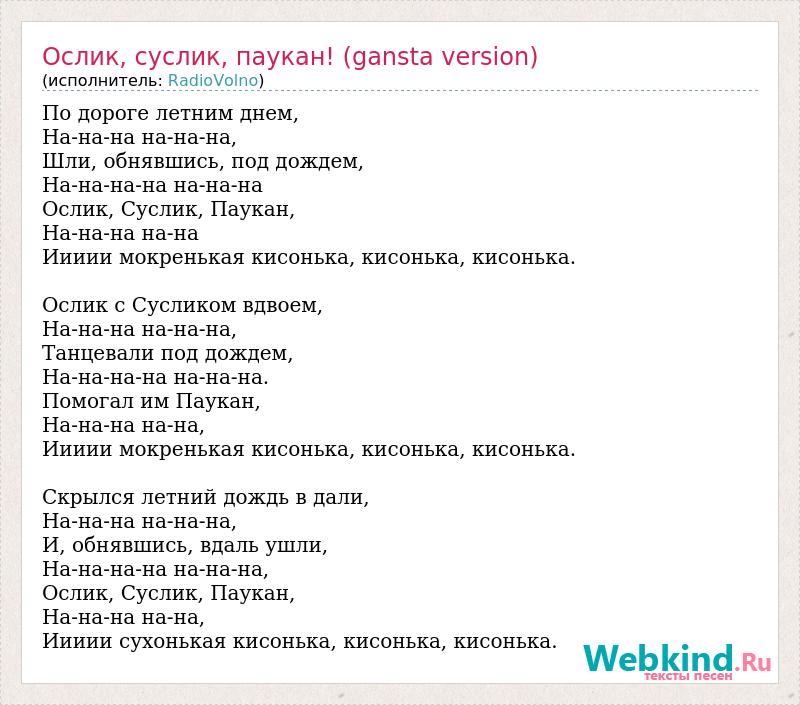 По дороге летним днем, На-на-на на-на-на, Шли, обнявшись, под дождем, На-на-на-на на-на-на Ослик, Суслик, Паукан, На-на-на на-на Иииии мокренькая кисонька, кисонька, кисонька. Ослик с Сусликом вдвоем, На-на-на на-на-на, Танцевали под дождем, На-на-на-на на-на-на. Помогал им Паукан, На-на-на на-на, Иииии мокренькая кисонька, кисонька, кисонька. Скрылся летний дождь в дали, На-на-на на-на-на, И, обнявшись, вдаль ушли, На-на-на-на на-на-на, Ослик, Суслик, Паукан, На-на-на на-на, Иииии сухонькая кисонька, кисонька, кисонька.