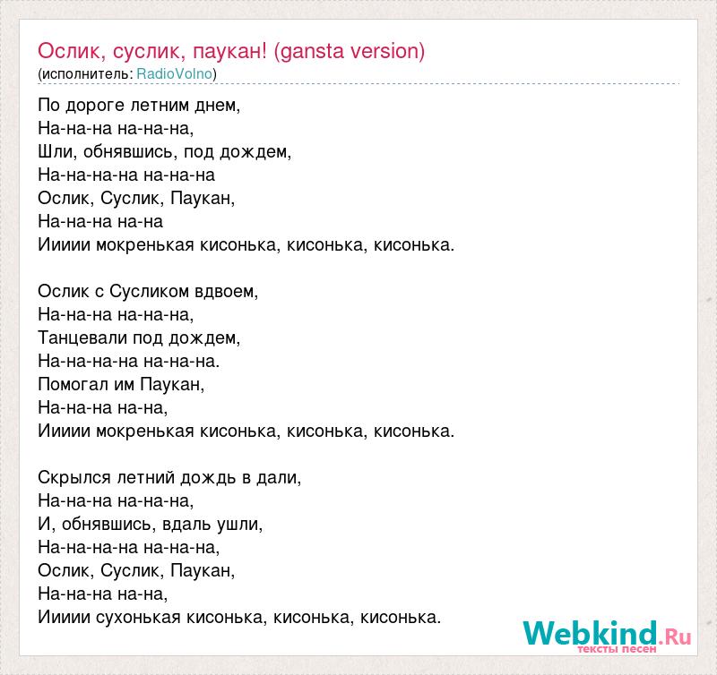 По дороге летним днем, На-на-на на-на-на, Шли, обнявшись, под дождем, На-на-на-на на-на-на Ослик, Суслик, Паукан, На-на-на на-на Иииии мокренькая кисонька, кисонька, кисонька. Ослик с Сусликом вдвоем, На-на-на на-на-на, Танцевали под дождем, На-на-на-на на-на-на. Помогал им Паукан, На-на-на на-на, Иииии мокренькая кисонька, кисонька, кисонька. Скрылся летний дождь в дали, На-на-на на-на-на, И, обнявшись, вдаль ушли, На-на-на-на на-на-на, Ослик, Суслик, Паукан, На-на-на на-на, Иииии сухонькая кисонька, кисонька, кисонька.
