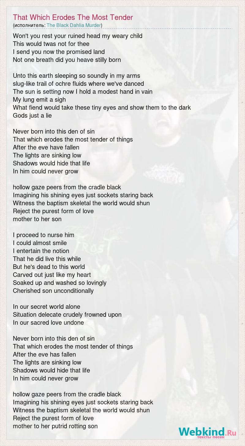 Won't you rest your ruined head my weary child This would twas not for thee I send you now the promised land Not one breath did you heave stilly born Unto this earth sleeping so soundly in my arms slug-like trail of ochre fluids where we've danced The sun is setting now I hold a modest hand in vain My lung emit a sigh What fiend would take these tiny eyes and show them to the dark Gods just a lie Never born into this den of sin That which erodes the most tender of things After the eve have fallen The lights are sinking low Shadows would hide that life In him could never grow hollow gaze peers from the cradle black Imagining his shining eyes just sockets staring back Witness the baptism skeletal the world would shun Reject the purest form of love mother to her son I proceed to nurse him I could almost smile I entertain the notion That he did live this while But he's dead to this world Carved out just like my heart Soaked up and washed so lovingly Cherished son unconditionally In our secret world alone Situation delecate crudely frowned upon In our sacred love undone Never born into this den of sin That which erodes the most tender of things After the eve has fallen The lights are sinking low Shadows would hide that life In him could never grow hollow gaze peers from the cradle black Imagining his shining eyes just sockets staring back Witness the baptism skeletal the world would shun Reject the purest form of love mother to her putrid rotting son