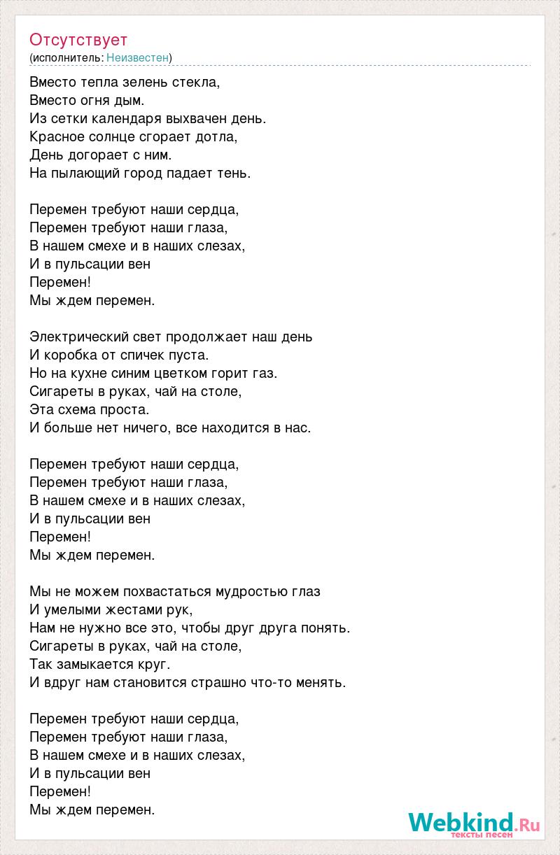 Вместо тепла зелень стекла, Вместо огня дым. Из сетки календаря выхвачен день. Красное солнце сгорает дотла, День догорает с ним. На пылающий город падает тень. Перемен требуют наши сердца, Перемен требуют наши глаза, В нашем смехе и в наших слезах, И в пульсации вен Перемен! Мы ждем перемен. Электрический свет продолжает наш день И коробка от спичек пуста. Но на кухне синим цветком горит газ. Сигареты в руках, чай на столе, Эта схема проста. И больше нет ничего, все находится в нас. Перемен требуют наши сердца, Перемен требуют наши глаза, В нашем смехе и в наших слезах, И в пульсации вен Перемен! Мы ждем перемен. Мы не можем похвастаться мудростью глаз И умелыми жестами рук, Нам не нужно все это, чтобы друг друга понять. Сигареты в руках, чай на столе, Так замыкается круг. И вдруг нам становится страшно что-то менять. Перемен требуют наши сердца, Перемен требуют наши глаза, В нашем смехе и в наших слезах, И в пульсации вен Перемен! Мы ждем перемен.