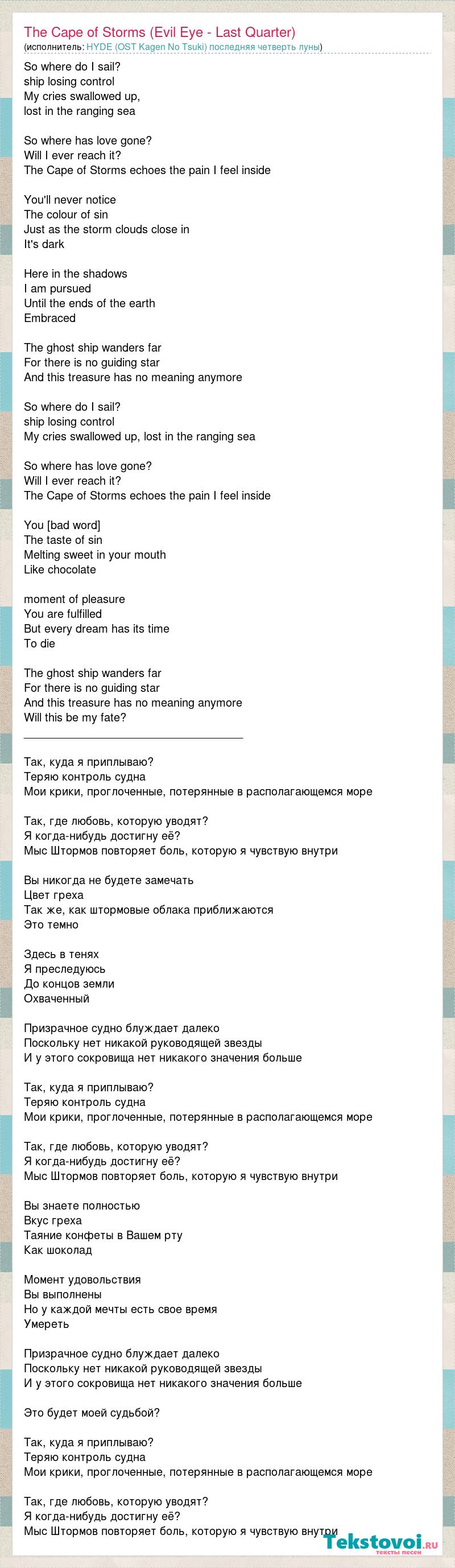 So where do I sail? ship losing control My cries swallowed up, lost in the ranging sea So where has love gone? Will I ever reach it? The Cape of Storms echoes the pain I feel inside You'll never notice The colour of sin Just as the storm clouds close in It's dark Here in the shadows I am pursued Until the ends of the earth Embraced The ghost ship wanders far For there is no guiding star And this treasure has no meaning anymore So where do I sail? ship losing control My cries swallowed up, lost in the ranging sea So where has love gone? Will I ever reach it? The Cape of Storms echoes the pain I feel inside You [bad word] The taste of sin Melting sweet in your mouth Like chocolate moment of pleasure You are fulfilled But every dream has its time To die The ghost ship wanders far For there is no guiding star And this treasure has no meaning anymore Will this be my fate? ___________________________________ Так, куда я приплываю? Теряю контроль судна Мои крики, проглоченные, потерянные в располагающемся море Так, где любовь, которую уводят? Я когда-нибудь достигну её? Мыс Штормов повторяет боль, которую я чувствую внутри Вы никогда не будете замечать Цвет греха Так же, как штормовые облака приближаются Это темно Здесь в тенях Я преследуюсь До концов земли Охваченный Призрачное судно блуждает далеко Поскольку нет никакой руководящей звезды И у этого сокровища нет никакого значения больше Так, куда я приплываю? Теряю контроль судна Мои крики, проглоченные, потерянные в располагающемся море Так, где любовь, которую уводят? Я когда-нибудь достигну её? Мыс Штормов повторяет боль, которую я чувствую внутри Вы знаете полностью Вкус греха Таяние конфеты в Вашем рту Как шоколад Момент удовольствия Вы выполнены Но у каждой мечты есть свое время Умереть Призрачное судно блуждает далеко Поскольку нет никакой руководящей звезды И у этого сокровища нет никакого значения больше Это будет моей судьбой? Так, куда я приплываю? Теряю контроль судна Мои крики, проглоченные, потерянные в располагающемся море Так, где любовь, которую уводят? Я когда-нибудь достигну её? Мыс Штормов повторяет боль, которую я чувствую внутри