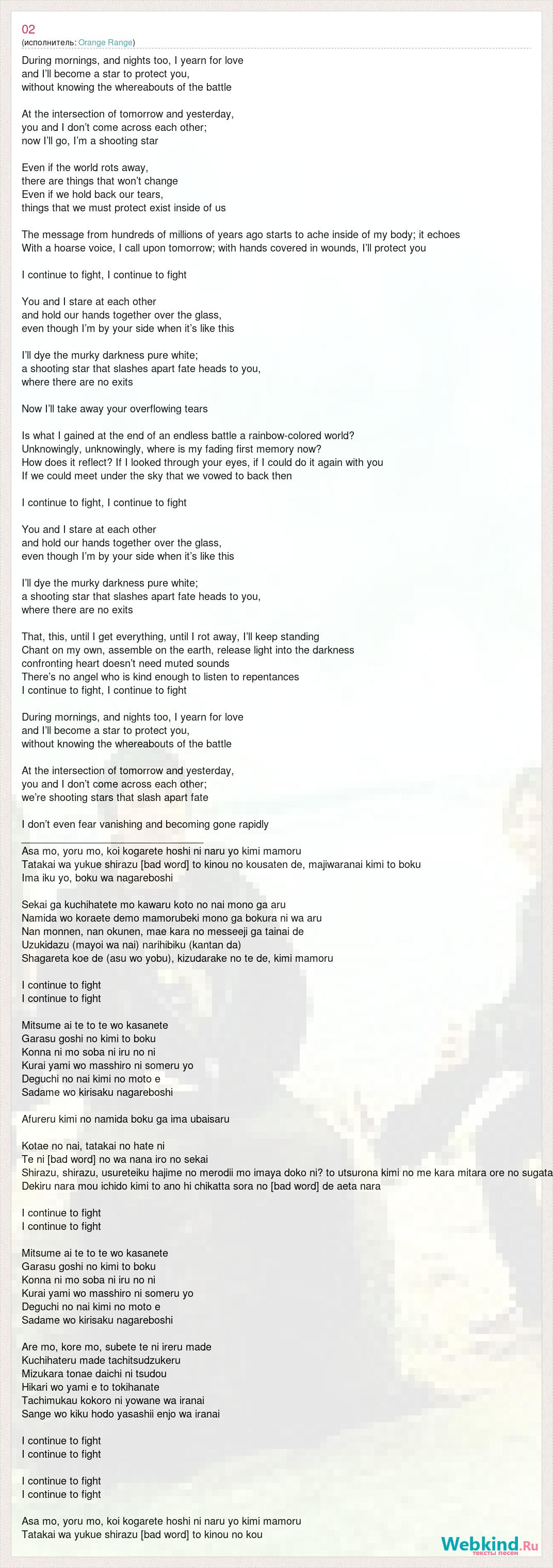 During mornings, and nights too, I yearn for love and I’ll become a star to protect you, without knowing the whereabouts of the battle At the intersection of tomorrow and yesterday, you and I don’t come across each other; now I’ll go, I’m a shooting star Even if the world rots away, there are things that won’t change Even if we hold back our tears, things that we must protect exist inside of us The message from hundreds of millions of years ago starts to ache inside of my body; it echoes With a hoarse voice, I call upon tomorrow; with hands covered in wounds, I’ll protect you I continue to fight, I continue to fight You and I stare at each other and hold our hands together over the glass, even though I’m by your side when it’s like this I’ll dye the murky darkness pure white; a shooting star that slashes apart fate heads to you, where there are no exits Now I’ll take away your overflowing tears Is what I gained at the end of an endless battle a rainbow-colored world? Unknowingly, unknowingly, where is my fading first memory now? How does it reflect? If I looked through your eyes, if I could do it again with you If we could meet under the sky that we vowed to back then I continue to fight, I continue to fight You and I stare at each other and hold our hands together over the glass, even though I’m by your side when it’s like this I’ll dye the murky darkness pure white; a shooting star that slashes apart fate heads to you, where there are no exits That, this, until I get everything, until I rot away, I’ll keep standing Chant on my own, assemble on the earth, release light into the darkness confronting heart doesn’t need muted sounds There’s no angel who is kind enough to listen to repentances I continue to fight, I continue to fight During mornings, and nights too, I yearn for love and I’ll become a star to protect you, without knowing the whereabouts of the battle At the intersection of tomorrow and yesterday, you and I don’t come across each other; we’re shooting stars that slash apart fate I don’t even fear vanishing and becoming gone rapidly ________________________________ Asa mo, yoru mo, koi kogarete hoshi ni naru yo kimi mamoru Tatakai wa yukue shirazu [bad word] to kinou no kousaten de, majiwaranai kimi to boku Ima iku yo, boku wa nagareboshi Sekai ga kuchihatete mo kawaru koto no nai mono ga aru Namida wo koraete demo mamorubeki mono ga bokura ni wa aru Nan monnen, nan okunen, mae kara no messeeji ga tainai de Uzukidazu (mayoi wa nai) narihibiku (kantan da) Shagareta koe de (asu wo yobu), kizudarake no te de, kimi mamoru I continue to fight I continue to fight Mitsume ai te to te wo kasanete Garasu goshi no kimi to boku Konna ni mo soba ni iru no ni Kurai yami wo masshiro ni someru yo Deguchi no nai kimi no moto e Sadame wo kirisaku nagareboshi Afureru kimi no namida boku ga ima ubaisaru Kotae no nai, tatakai no hate ni Te ni [bad word] no wa nana iro no sekai Shirazu, shirazu, usureteiku hajime no merodii mo imaya doko ni? to utsurona kimi no me kara mitara ore no sugata Dekiru nara mou ichido kimi to ano hi chikatta sora no [bad word] de aeta nara I continue to fight I continue to fight Mitsume ai te to te wo kasanete Garasu goshi no kimi to boku Konna ni mo soba ni iru no ni Kurai yami wo masshiro ni someru yo Deguchi no nai kimi no moto e Sadame wo kirisaku nagareboshi Are mo, kore mo, subete te ni ireru made Kuchihateru made tachitsudzukeru Mizukara tonae daichi ni tsudou Hikari wo yami e to tokihanate Tachimukau kokoro ni yowane wa iranai Sange wo kiku hodo yasashii enjo wa iranai I continue to fight I continue to fight I continue to fight I continue to fight Asa mo, yoru mo, koi kogarete hoshi ni naru yo kimi mamoru Tatakai wa yukue shirazu [bad word] to kinou no kou