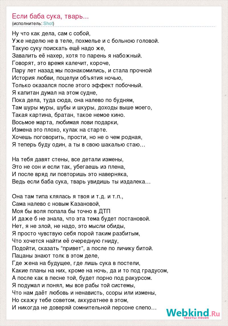 Ну что как дела, сам с собой, Уже неделю не в теле, похмелье и с больною головой. Такую суку поискать ещё надо же, Завалить её нахер, хотя то парень я набожный. Говорят, это время калечит, короче, Пару лет назад мы познакомились, и стала прочной История любви, поцелуи объятия ночью, Только оказался после этого эффект побочный. Я капитан думал на этом судне, Пока дела, туда сюда, она налево по будням, Там шуры муры, шубы и шкуры, доходы выше моего, Такая картина, братан, такое немое кино. Восьмое марта, любимая лови подарки, Измена это плохо, кулак на старте. Хочешь поговорить, прости, но не о чем родная, Я теперь буду один, а ты в свою шакалью стаю… На тебя давят стены, все детали измены, Это не сон и если так, убегаешь из плена, И после вряд ли повторишь это наверняка, Ведь если баба сука, тварь увидишь ты издалека… Она там типа клялась я твоя и т.д. и т.п., Сама налево с новым Казановой, Моя бы воля попала бы точно в ДТП И даже б не знала, что эта тема будет постановой. Нет, я не злой, не надо, это мысли обиды, Я просто чувствую себя порой таким разбитым, Что хочется найти её очередную гниду, Подойти, сказать “привет”, а после по личику битой. Пацаны знают толк в этом деле, Где жена на будущее, где лишь сука в постели, Какие планы на них, кроме на ночь, да и то под градусом, А после как в песне той, будет порно под ракурсом. Я подумал и понял, мы все рабы той системы, Что нам даёт любовь и ненависть, ссоры или измены, Но скажу тебе советом, аккуратнее в этом, И никогда не доверяй сомнительной персоне слепо…