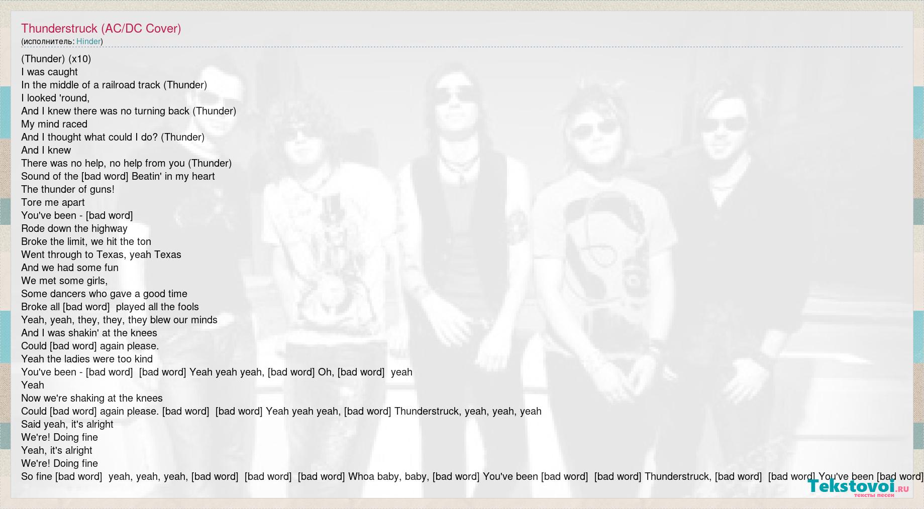 (Thunder) (x10) I was caught In the middle of a railroad track (Thunder) I looked 'round, And I knew there was no turning back (Thunder) My mind raced And I thought what could I do? (Thunder) And I knew There was no help, no help from you (Thunder) Sound of the drums Beatin' in my heart The thunder of guns! Tore me apart You've been - thunderstruck! Rode down the highway Broke the limit, we hit the ton Went through to Texas, yeah Texas And we had some fun We met some girls, Some dancers who gave a good time Broke all the rules, played all the fools Yeah, yeah, they, they, they blew our minds And I was shakin' at the knees Could I come again please. Yeah the ladies were too kind You've been - thunderstruck, thunderstruck Yeah yeah yeah, thunderstruck Oh, thunderstruck, yeah Yeah Now we're shaking at the knees Could I come again please. Thunderstruck, thunderstruck Yeah yeah yeah, thunderstruck Thunderstruck, yeah, yeah, yeah Said yeah, it's alright We're! Doing fine Yeah, it's alright We're! Doing fine So fine Thunderstruck, yeah, yeah, yeah, Thunderstruck, thunderstruck, thunderstruck Whoa baby, baby, thunderstruck You've been thunderstruck, thunderstruck Thunderstruck, thunderstruck, thunderstruck You've been thunderstruck