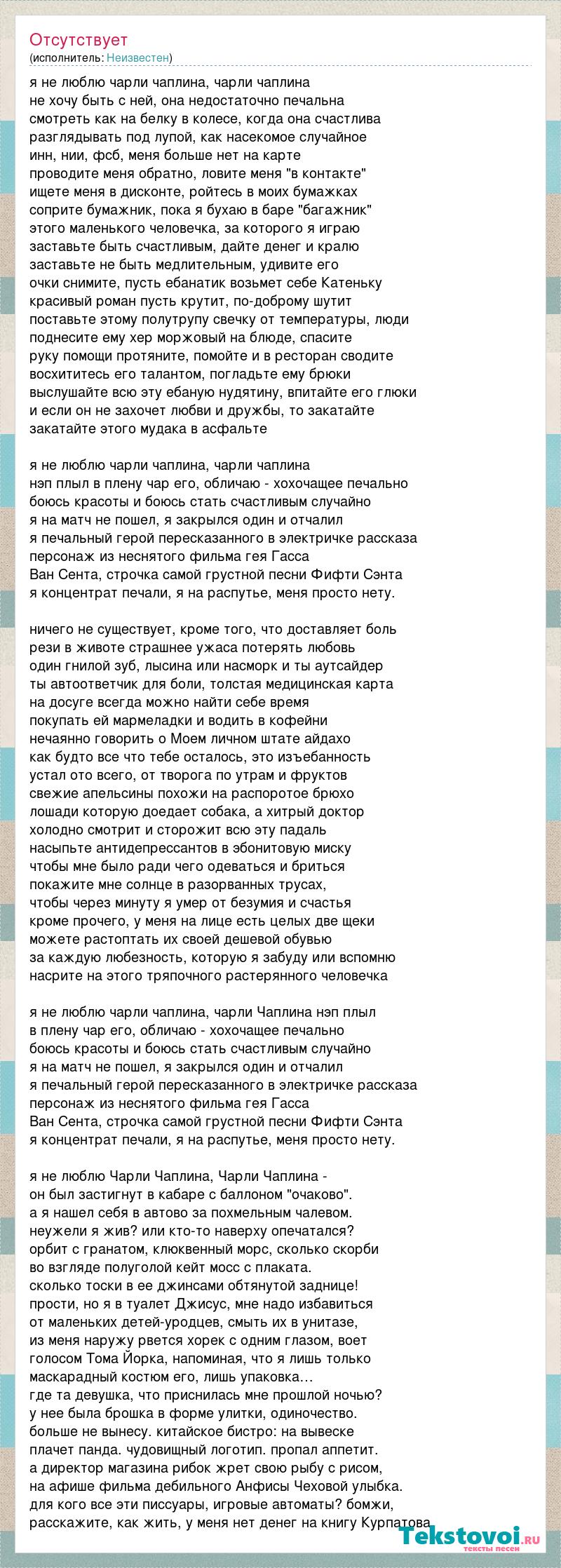 я не люблю чарли чаплина, чарли чаплина не хочу быть с ней, она недостаточно печальна смотреть как на белку в колесе, когда она счастлива разглядывать под лупой, как насекомое случайное инн, нии, фсб, меня больше нет на карте проводите меня обратно, ловите меня "в контакте" ищете меня в дисконте, ройтесь в моих бумажках соприте бумажник, пока я бухаю в баре "багажник" этого маленького человечка, за которого я играю заставьте быть счастливым, дайте денег и кралю заставьте не быть медлительным, удивите его очки снимите, пусть ебанатик возьмет себе Катеньку красивый роман пусть крутит, по-доброму шутит поставьте этому полутрупу свечку от температуры, люди поднесите ему хер моржовый на блюде, спасите руку помощи протяните, помойте и в ресторан сводите восхититесь его талантом, погладьте ему брюки выслушайте всю эту ебаную нудятину, впитайте его глюки и если он не захочет любви и дружбы, то закатайте закатайте этого мудака в асфальте я не люблю чарли чаплина, чарли чаплина нэп плыл в плену чар его, обличаю - хохочащее печально боюсь красоты и боюсь стать счастливым случайно я на матч не пошел, я закрылся один и отчалил я печальный герой пересказанного в электричке рассказа персонаж из неснятого фильма гея Гасса Ван Сента, строчка самой грустной песни Фифти Сэнта я концентрат печали, я на распутье, меня просто нету. ничего не существует, кроме того, что доставляет боль рези в животе страшнее ужаса потерять любовь один гнилой зуб, лысина или насморк и ты аутсайдер ты автоответчик для боли, толстая медицинская карта на досуге всегда можно найти себе время покупать ей мармеладки и водить в кофейни нечаянно говорить о Моем личном штате айдахо как будто все что тебе осталось, это изъебанность устал ото всего, от творога по утрам и фруктов свежие апельсины похожи на распоротое брюхо лошади которую доедает собака, а хитрый доктор холодно смотрит и сторожит всю эту падаль насыпьте антидепрессантов в эбонитовую миску чтобы мне было ради чего одеваться и бриться покажите мне солнце в разорванных трусах, чтобы через минуту я умер от безумия и счастья кроме прочего, у меня на лице есть целых две щеки можете растоптать их своей дешевой обувью за каждую любезность, которую я забуду или вспомню насрите на этого тряпочного растерянного человечка я не люблю чарли чаплина, чарли Чаплина нэп плыл в плену чар его, обличаю - хохочащее печально боюсь красоты и боюсь стать счастливым случайно я на матч не пошел, я закрылся один и отчалил я печальный герой пересказанного в электричке рассказа персонаж из неснятого фильма гея Гасса Ван Сента, строчка самой грустной песни Фифти Сэнта я концентрат печали, я на распутье, меня просто нету. я не люблю Чарли Чаплина, Чарли Чаплина - он был застигнут в кабаре с баллоном "очаково". а я нашел себя в автово за похмельным чалевом. неужели я жив? или кто-то наверху опечатался? орбит с гранатом, клюквенный морс, сколько скорби во взгляде полуголой кейт мосс с плаката. сколько тоски в ее джинсами обтянутой заднице! прости, но я в туалет Джисус, мне надо избавиться от маленьких детей-уродцев, смыть их в унитазе, из меня наружу рвется хорек с одним глазом, воет голосом Тома Йорка, напоминая, что я лишь только маскарадный костюм его, лишь упаковка… где та девушка, что приснилась мне прошлой ночью? у нее была брошка в форме улитки, одиноче