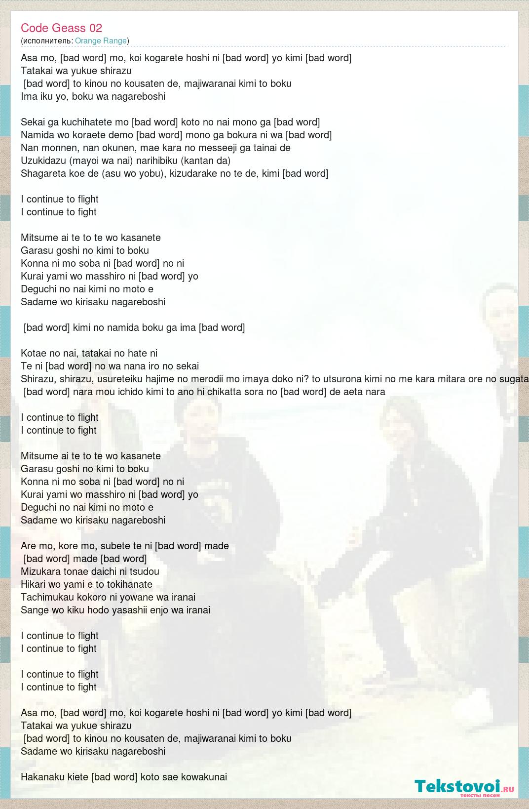 Asa mo, [bad word] mo, koi kogarete hoshi ni [bad word] yo kimi [bad word] Tatakai wa yukue shirazu [bad word] to kinou no kousaten de, majiwaranai kimi to boku Ima iku yo, boku wa nagareboshi Sekai ga kuchihatete mo [bad word] koto no nai mono ga [bad word] Namida wo koraete demo [bad word] mono ga bokura ni wa [bad word] Nan monnen, nan okunen, mae kara no messeeji ga tainai de Uzukidazu (mayoi wa nai) narihibiku (kantan da) Shagareta koe de (asu wo yobu), kizudarake no te de, kimi [bad word] I continue to flight I continue to fight Mitsume ai te to te wo kasanete Garasu goshi no kimi to boku Konna ni mo soba ni [bad word] no ni Kurai yami wo masshiro ni [bad word] yo Deguchi no nai kimi no moto e Sadame wo kirisaku nagareboshi [bad word] kimi no namida boku ga ima [bad word] Kotae no nai, tatakai no hate ni Te ni [bad word] no wa nana iro no sekai Shirazu, shirazu, usureteiku hajime no merodii mo imaya doko ni? to utsurona kimi no me kara mitara ore no sugata [bad word] nara mou ichido kimi to ano hi chikatta sora no [bad word] de aeta nara I continue to flight I continue to fight Mitsume ai te to te wo kasanete Garasu goshi no kimi to boku Konna ni mo soba ni [bad word] no ni Kurai yami wo masshiro ni [bad word] yo Deguchi no nai kimi no moto e Sadame wo kirisaku nagareboshi Are mo, kore mo, subete te ni [bad word] made [bad word] made [bad word] Mizukara tonae daichi ni tsudou Hikari wo yami e to tokihanate Tachimukau kokoro ni yowane wa iranai Sange wo kiku hodo yasashii enjo wa iranai I continue to flight I continue to fight I continue to flight I continue to fight Asa mo, [bad word] mo, koi kogarete hoshi ni [bad word] yo kimi [bad word] Tatakai wa yukue shirazu [bad word] to kinou no kousaten de, majiwaranai kimi to boku Sadame wo kirisaku nagareboshi Hakanaku kiete [bad word] koto sae kowakunai