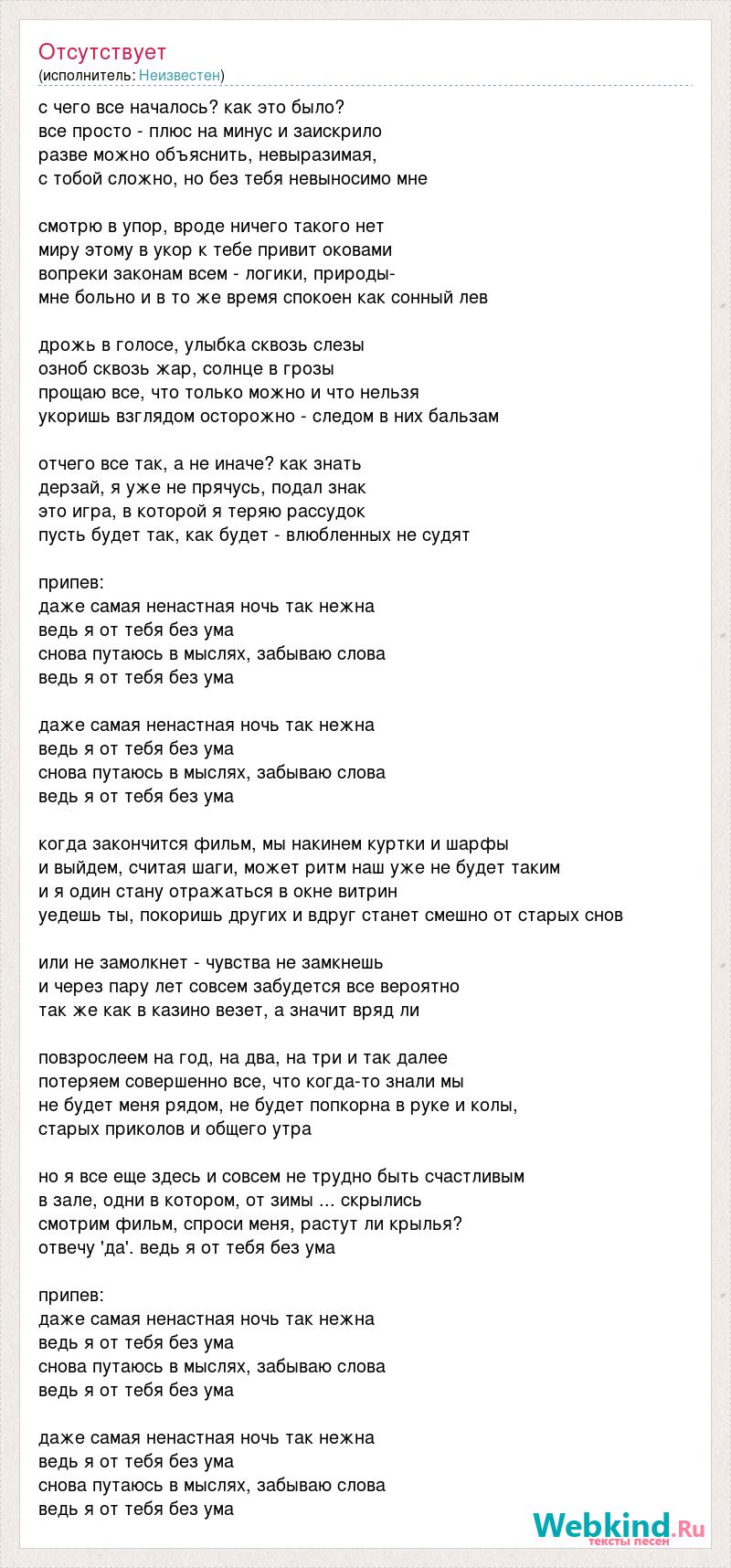 с чего все началось? как это было? все просто - плюс на минус и заискрило разве можно объяснить, невыразимая, с тобой сложно, но без тебя невыносимо мне смотрю в упор, вроде ничего такого нет миру этому в укор к тебе привит оковами вопреки законам всем - логики, природы- мне больно и в то же время спокоен как сонный лев дрожь в голосе, улыбка сквозь слезы озноб сквозь жар, солнце в грозы прощаю все, что только можно и что нельзя укоришь взглядом осторожно - следом в них бальзам отчего все так, а не иначе? как знать дерзай, я уже не прячусь, подал знак это игра, в которой я теряю рассудок пусть будет так, как будет - влюбленных не судят припев: даже самая ненастная ночь так нежна ведь я от тебя без ума снова путаюсь в мыслях, забываю слова ведь я от тебя без ума даже самая ненастная ночь так нежна ведь я от тебя без ума снова путаюсь в мыслях, забываю слова ведь я от тебя без ума когда закончится фильм, мы накинем куртки и шарфы и выйдем, считая шаги, может ритм наш уже не будет таким и я один стану отражаться в окне витрин уедешь ты, покоришь других и вдруг станет смешно от старых снов или не замолкнет - чувства не замкнешь и через пару лет совсем забудется все вероятно так же как в казино везет, а значит вряд ли повзрослеем на год, на два, на три и так далее потеряем совершенно все, что когда-то знали мы не будет меня рядом, не будет попкорна в руке и колы, старых приколов и общего утра но я все еще здесь и совсем не трудно быть счастливым в зале, одни в котором, от зимы ... скрылись смотрим фильм, спроси меня, растут ли крылья? отвечу 'да'. ведь я от тебя без ума припев: даже самая ненастная ночь так нежна ведь я от тебя без ума снова путаюсь в мыслях, забываю слова ведь я от тебя без ума даже самая ненастная ночь так нежна ведь я от тебя без ума снова путаюсь в мыслях, забываю слова ведь я от тебя без ума