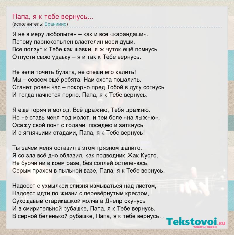 Я не в меру любопытен – как и все «карандаши». Потому парнокопытен властелин моей души. Все ползут к Тебе как шавки, я ж чуток ещё помнусь. Отпусти свою удавку – я и так к Тебе вернусь. Не вели точить булата, не спеши его калить! Мы – совсем ещё ребята. Нам охота пошалить. Станет ровен час – покорно пред Тобой в дугу согнусь И тогда начнется порно. Папа, я к Тебе вернусь. Я еще горяч и молод. Всё дражню, Тебя дражню. Но не ставь меня под молот, и тем боле «на лыжню». Осажу свой понт с годами, поседею и заткнусь И с ягнячьими стадами, Папа, я к Тебе вернусь! Ты зачем меня оставил в этом грязном шапито. Я со зла всё дно облазил, как подводник Жак Кусто. Не бурчи ни в коем разе, без соплей остепенюсь, Серым прахом в пыльной вазе, Папа, я к Тебе вернусь. Надоест с ухмылкой слизня измываться над листом, Надоест идти по жизни с перевёрнутым крестом, Сухощавым старикашкой молча в Днепр окунусь И в смирительной рубашке, Папа, я к Тебе вернусь. В серной беленькой рубашке, Папа, я к тебе вернусь…