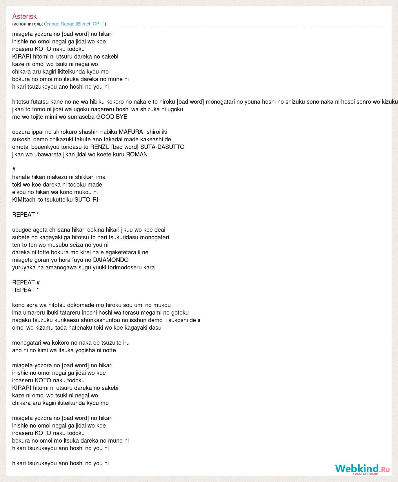 miageta yozora no [bad word] no hikari inishie no omoi negai ga jidai wo koe iroaseru KOTO naku todoku KIRARI hitomi ni utsuru dareka no sakebi kaze ni omoi wo tsuki ni negai wo chikara aru kagiri ikiteikunda kyou mo bokura no omoi mo itsuka dareka no mune ni hikari tsuzukeyou ano hoshi no you ni hitotsu futatsu kane no ne wa hibiku kokoro no naka e to hiroku [bad word] monogatari no youna hoshi no shizuku sono naka ni hosoi senro wo kizuku jikan to tomo ni jidai wa ugoku nagareru hoshi wa shizuka ni ugoku me wo tojite mimi wo sumaseba GOOD BYE oozora ippai no shirokuro shashin nabiku MAFURA- shiroi iki sukoshi demo chikazuki takute ano takadai made kakeashi de omotai bouenkyou toridasu to RENZU [bad word] SUTA-DASUTTO jikan wo ubawareta jikan jidai wo koete kuru ROMAN # hanate hikari makezu ni shikkari ima toki wo koe dareka ni todoku made eikou no hikari wa kono mukou ni KIMItachi to tsukutteiku SUTO-RI- REPEAT * ubugoe ageta chiisana hikari ookina hikari jikuu wo koe deai subete no kagayaki ga hitotsu to nari tsukuridasu monogatari ten to ten wo musubu seiza no you ni dareka ni totte bokura mo kirei na e egaketetara ii ne miagete goran yo hora fuyu no DAIAMONDO yuruyaka na amanogawa sugu yuuki torimodoseru kara REPEAT # REPEAT * kono sora wa hitotsu dokomade mo hiroku sou umi no mukou ima umareru ibuki tatareru inochi hoshi wa terasu megami no gotoku nagaku tsuzuku kurikaesu shunkashuntou no isshun demo ii sukoshi de ii omoi wo kizamu tada hatenaku toki wo koe kagayaki dasu monogatari wa kokoro no naka de tsuzuite iru ano hi no kimi wa itsuka yogisha ni notte miageta yozora no [bad word] no hikari inishie no omoi negai ga jidai wo koe iroaseru KOTO naku todoku KIRARI hitomi ni utsuru dareka no sakebi kaze ni omoi wo tsuki ni negai wo chikara aru kagiri ikiteikunda kyou mo miageta yozora no [bad word] no hikari inishie no omoi negai ga jidai wo koe iroaseru KOTO naku todoku bokura no omoi mo itsuka dareka no mune ni hikari tsuzukeyou ano hoshi no you ni hikari tsuzukeyou ano hoshi no you ni