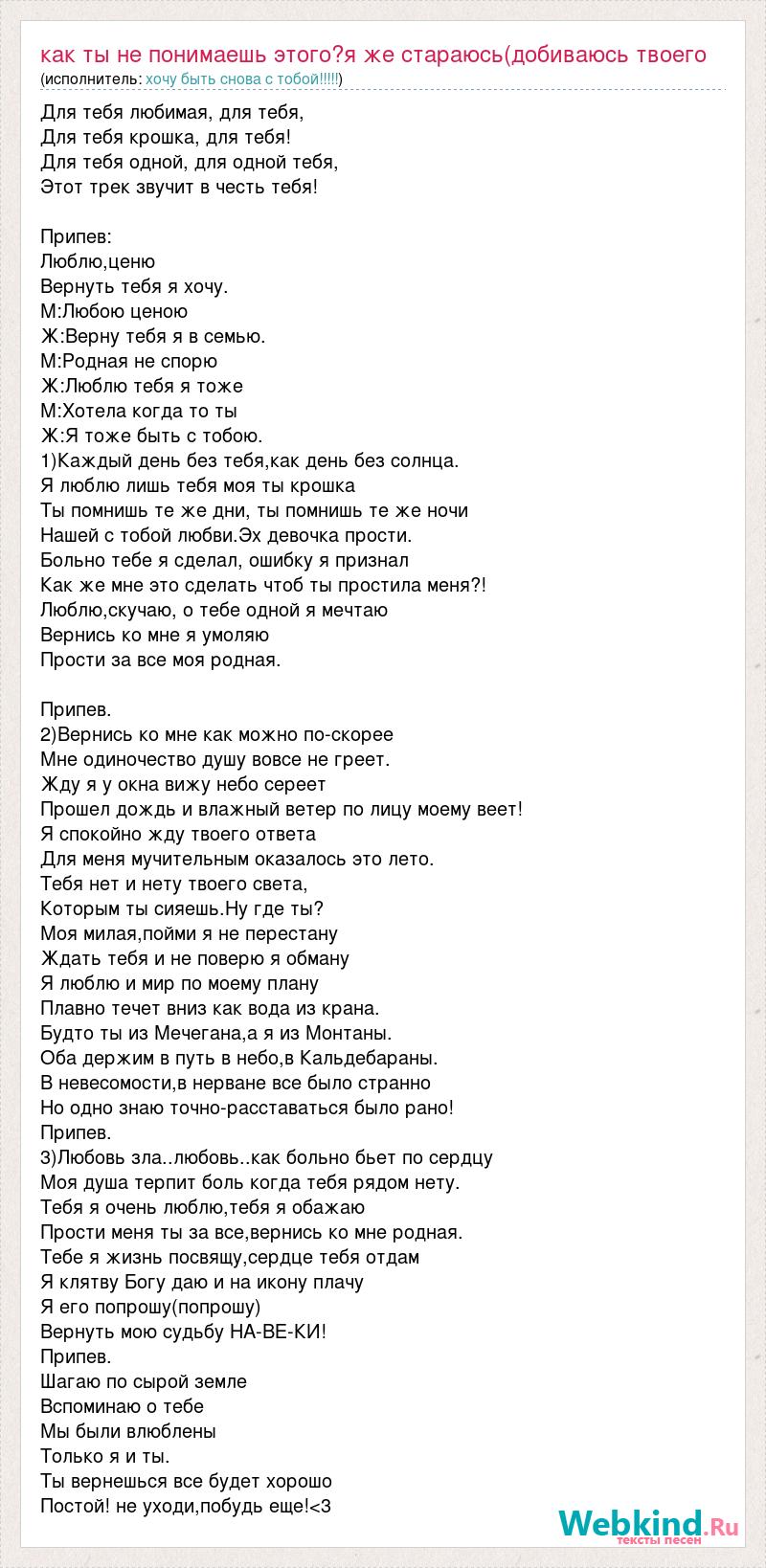 Для тебя любимая, для тебя, Для тебя крошка, для тебя! Для тебя одной, для одной тебя, Этот трек звучит в честь тебя! Припев: Люблю,ценю Вернуть тебя я хочу. М:Любою ценою Ж:Верну тебя я в семью. М:Родная не спорю Ж:Люблю тебя я тоже М:Хотела когда то ты Ж:Я тоже быть с тобою. 1)Каждый день без тебя,как день без солнца. Я люблю лишь тебя моя ты крошка Ты помнишь те же дни, ты помнишь те же ночи Нашей с тобой любви.Эх девочка прости. Больно тебе я сделал, ошибку я признал Как же мне это сделать чтоб ты простила меня?! Люблю,скучаю, о тебе одной я мечтаю Вернись ко мне я умоляю Прости за все моя родная. Припев. 2)Вернись ко мне как можно по-скорее Мне одиночество душу вовсе не греет. Жду я у окна вижу небо сереет Прошел дождь и влажный ветер по лицу моему веет! Я спокойно жду твоего ответа Для меня мучительным оказалось это лето. Тебя нет и нету твоего света, Которым ты сияешь.Ну где ты? Моя милая,пойми я не перестану Ждать тебя и не поверю я обману Я люблю и мир по моему плану Плавно течет вниз как вода из крана. Будто ты из Мечегана,а я из Монтаны. Оба держим в путь в небо,в Кальдебараны. В невесомости,в нерване все было странно Но одно знаю точно-расставаться было рано! Припев. 3)Любовь зла..любовь..как больно бьет по сердцу Моя душа терпит боль когда тебя рядом нету. Тебя я очень люблю,тебя я обажаю Прости меня ты за все,вернись ко мне родная. Тебе я жизнь посвящу,сердце тебя отдам Я клятву Богу даю и на икону плачу Я его попрошу(попрошу) Вернуть мою судьбу НА-ВЕ-КИ! Припев. Шагаю по сырой земле Вспоминаю о тебе Мы были влюблены Только я и ты. Ты вернешься все будет хорошо Постой! не уходи,побудь еще!<3