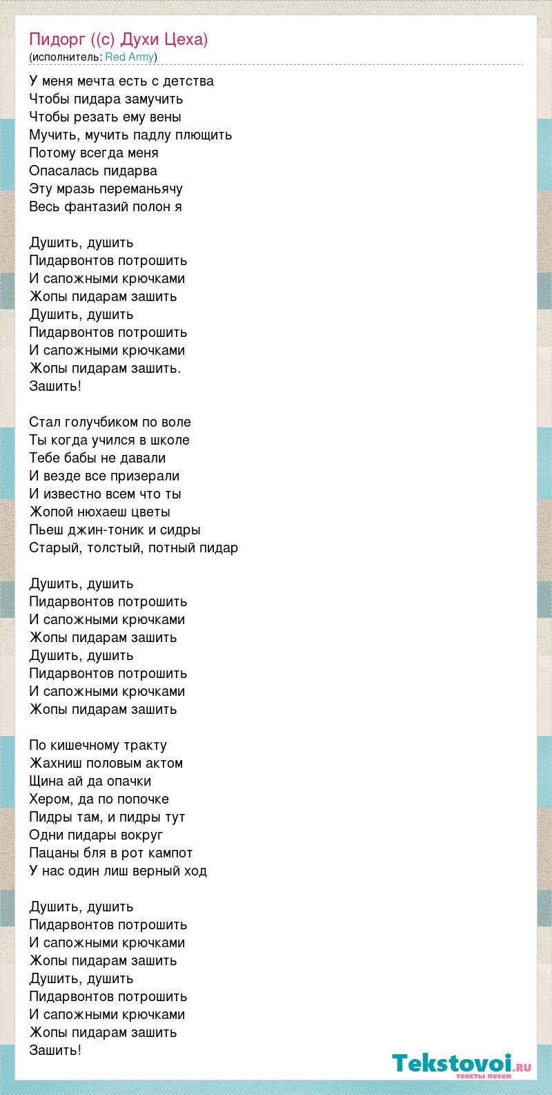 У меня мечта есть с детства Чтобы пидара замучить Чтобы резать ему вены Мучить, мучить падлу плющить Потому всегда меня Опасалась пидарва Эту мразь переманьячу Весь фантазий полон я Душить, душить Пидарвонтов потрошить И сапожными крючками Жопы пидарам зашить Душить, душить Пидарвонтов потрошить И сапожными крючками Жопы пидарам зашить. Зашить! Стал голучбиком по воле Ты когда учился в школе Тебе бабы не давали И везде все призерали И известно всем что ты Жопой нюхаеш цветы Пьеш джин-тоник и сидры Старый, толстый, потный пидар Душить, душить Пидарвонтов потрошить И сапожными крючками Жопы пидарам зашить Душить, душить Пидарвонтов потрошить И сапожными крючками Жопы пидарам зашить По кишечному тракту Жахниш половым актом Щина ай да опачки Хером, да по попочке Пидры там, и пидры тут Одни пидары вокруг Пацаны бля в рот кампот У нас один лиш верный ход Душить, душить Пидарвонтов потрошить И сапожными крючками Жопы пидарам зашить Душить, душить Пидарвонтов потрошить И сапожными крючками Жопы пидарам зашить Зашить!
