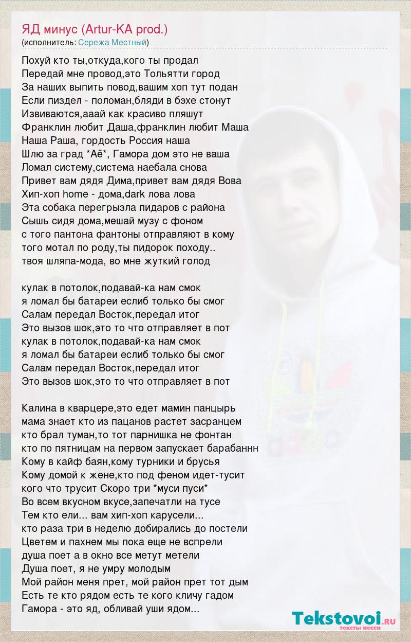 Похуй кто ты,откуда,кого ты продал Передай мне провод,это Тольятти город За наших выпить повод,вашим хоп тут подан Если пиздел - поломан,бляди в бэхе стонут Извиваются,ааай как красиво пляшут Франклин любит Даша,франклин любит Маша Наша Раша, гордость Россия наша Шлю за град *Аё*, Гамора дом это не ваша Ломал систему,система наебала снова Привет вам дядя Дима,привет вам дядя Вова Хип-хоп homе - дома,dark лова лова Эта собака перегрызла пидаров с района Сышь сидя дома,мешай музу с фоном с того пантона фантоны отправляют в кому того мотал по роду,ты пидорок походу.. твоя шляпа-мода, во мне жуткий голод кулак в потолок,подавай-ка нам смок я ломал бы батареи еслиб только бы смог Салам передал Восток,передал итог Это вызов шок,это то что отправляет в пот кулак в потолок,подавай-ка нам смок я ломал бы батареи еслиб только бы смог Салам передал Восток,передал итог Это вызов шок,это то что отправляет в пот Калина в кварцере,это едет мамин панцырь мама знает кто из пацанов растет засранцем кто брал туман,то тот парнишка не фонтан кто по пятницам на первом запускает барабаннн Кому в кайф баян,кому турники и брусья Кому домой к жене,кто под феном идет-тусит кого что трусит Скоро три *муси пуси* Во всем вкусном вкусе,запечатли на тусе Тем кто ели... вам хип-хоп карусели... кто раза три в неделю добирались до постели Цветем и пахнем мы пока еще не вспрели душа поет а в окно все метут метели Душа поет, я не умру молодым Мой район меня прет, мой район прет тот дым Есть те кто рядом есть те кого кличу гадом Гамора - это яд, обливай уши ядом...