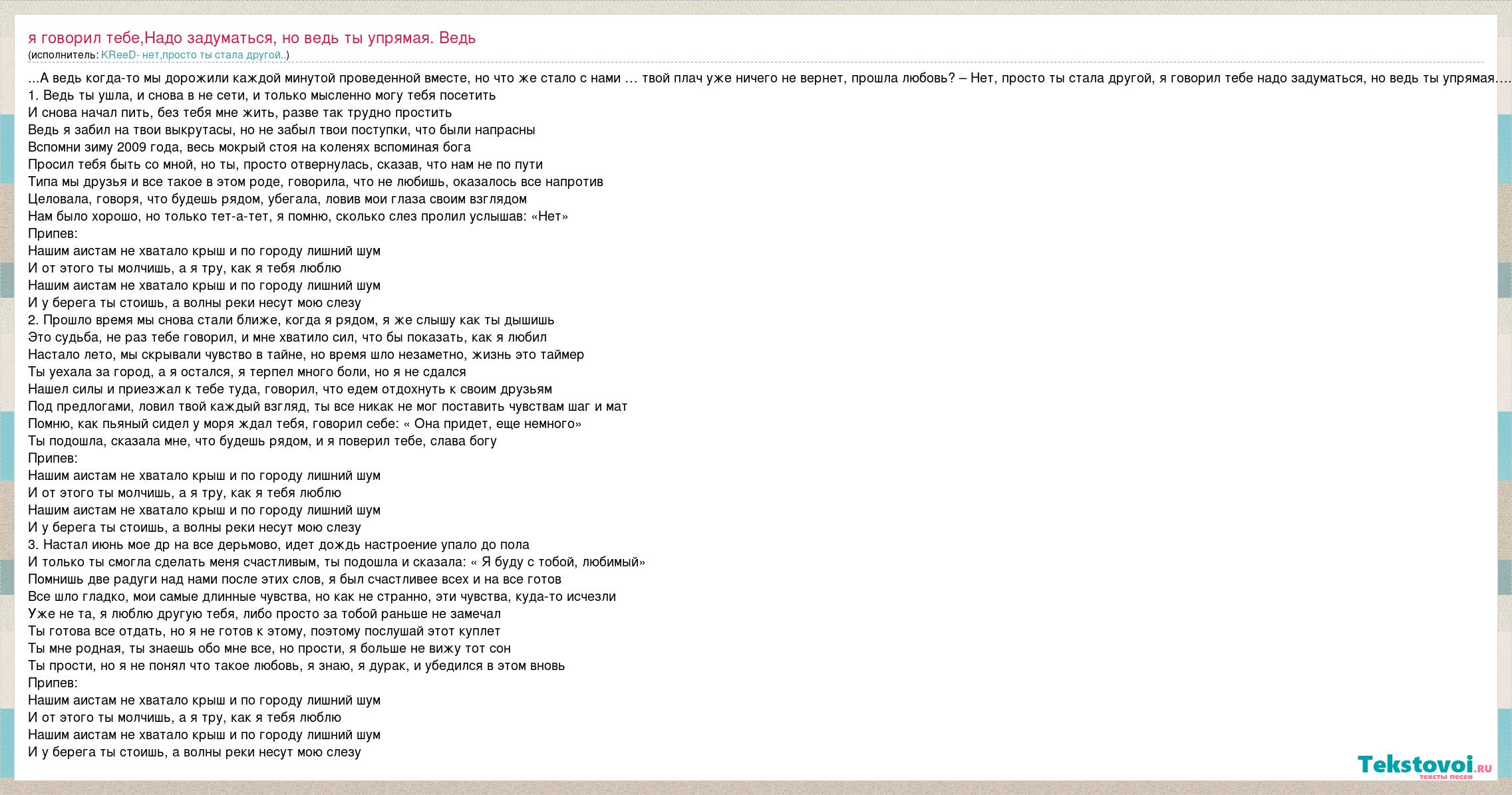 Главная→Исполнители→KReeD- нет,просто ты стала другой..→Я говорил тебе,Надо задуматься, но ведь ты упрямая. Ведь ты ушла, и сно