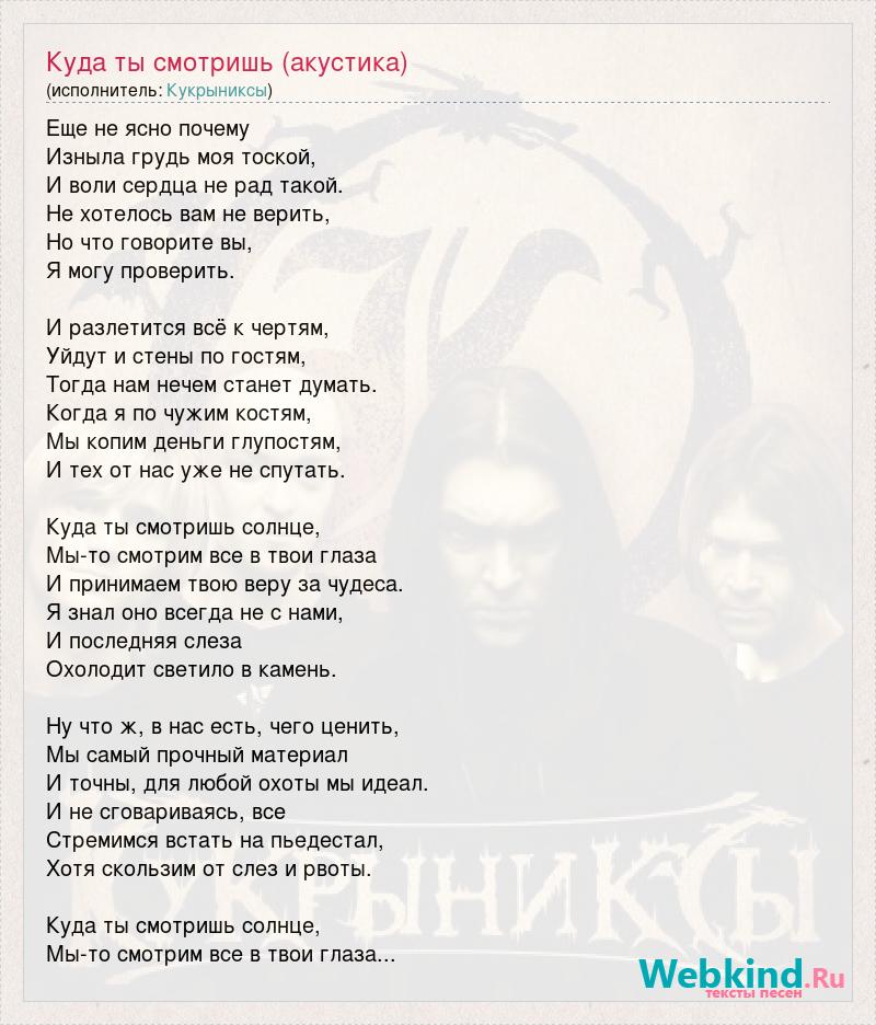 Еще не ясно почему Изныла грудь моя тоской, И воли сердца не рад такой. Не хотелось вам не верить, Но что говорите вы, Я могу проверить. И разлетится всё к чертям, Уйдут и стены по гостям, Тогда нам нечем станет думать. Когда я по чужим костям, Мы копим деньги глупостям, И тех от нас уже не спутать. Куда ты смотришь солнце, Мы-то смотрим все в твои глаза И принимаем твою веру за чудеса. Я знал оно всегда не с нами, И последняя слеза Охолодит светило в камень. Ну что ж, в нас есть, чего ценить, Мы самый прочный материал И точны, для любой охоты мы идеал. И не сговариваясь, все Стремимся встать на пьедестал, Хотя скользим от слез и рвоты. Куда ты смотришь солнце, Мы-то смотрим все в твои глаза...