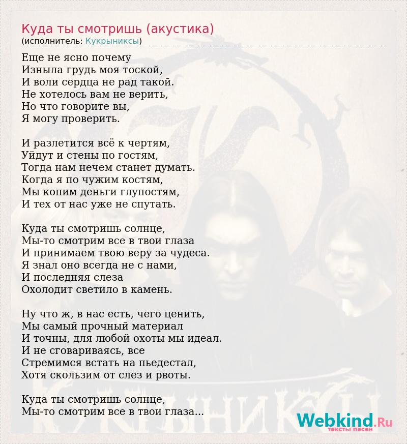 Еще не ясно почему Изныла грудь моя тоской, И воли сердца не рад такой. Не хотелось вам не верить, Но что говорите вы, Я могу проверить. И разлетится всё к чертям, Уйдут и стены по гостям, Тогда нам нечем станет думать. Когда я по чужим костям, Мы копим деньги глупостям, И тех от нас уже не спутать. Куда ты смотришь солнце, Мы-то смотрим все в твои глаза И принимаем твою веру за чудеса. Я знал оно всегда не с нами, И последняя слеза Охолодит светило в камень. Ну что ж, в нас есть, чего ценить, Мы самый прочный материал И точны, для любой охоты мы идеал. И не сговариваясь, все Стремимся встать на пьедестал, Хотя скользим от слез и рвоты. Куда ты смотришь солнце, Мы-то смотрим все в твои глаза...