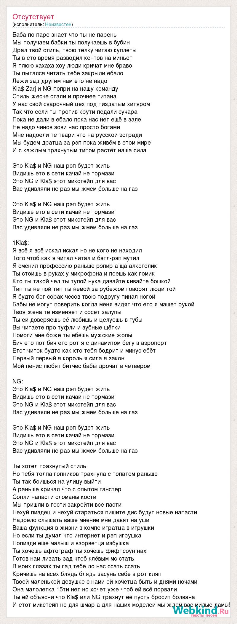 Баба по паре знает что ты не парень Мы получаем бабки ты получаешь в бубин Драл твой стиль, твою телку читаю куплеты Ты в ето время разводил кентов на миньет Я плюю хахаха хоу люди кричат мне браво Ты пытался читать тебе закрыли ебало Лежи зад другим нам ето не надо Kla$ Zarj и NG попри на нашу команду Стиль жесче стали и прочнее титана У нас свой сварочный цех под пиздатым хитяром Так что если ты против крути педали сучара Пока не дали в ебало пока нас нет ещё в зале Не надо чинов зови нас просто богами Мне надоели те твари что на русской эстради Мы будем дратца за рэп пока живём в етом мире И с каждым трахнутым типом растёт наша сила Это Kla$ и NG наш рэп будет жить Видишь ето в сети качай не тормази Это NG и Kla$ этот микстейп для вас Вас удивляли не раз мы жмем больше на газ Это Kla$ и NG наш рэп будет жить Видишь ето в сети качай не тормази Это NG и Kla$ этот микстейп для вас Вас удивляли не раз мы жмем больше на газ 1Kla$: Я всё я всё искал искал но не кого не находил Того чтоб как я читал читал и бэтл-рэп мутил Я сменил профессию раньше рэпир а ща алкоголик Ты стоишь в руках у микрофона и поешь как гомик Кто ты такой чел ты тупой нука давайте кивайте бошкой Тип ты не пой тип ты немой за рубежом говорят люди той Я будто бог сорак чесов твою подругу пинал ногой Бабы не могут поверить когда меня видят что ето я машет рукой Твоя жена те изменяет и сосет залупы Ты ей доверяешь её любишь и целуешь в губы Вы читаете про туфли и зубные щётки Помоги мне боже ты ебёшь мужские жопы Бич ето пот бич ето рот я с динамитом бегу в аэропорт Етот читок будто как кто тебя бодрит и минус ебёт Первый первый я король я сила я закон Мой пенис любят битчес бабы дрочат в четвером NG: Это Kla$ и NG наш рэп будет жить Видишь ето в сети качай не тормази Это NG и Kla$ этот микстейп для вас Вас удивляли не раз мы жмем больше на газ Это Kla$ и NG наш рэп будет жить Видишь ето в сети качай не тормази Это NG и Kla$ этот микстейп для вас Вас удивляли не раз мы жмем больше на газ Ты хотел трахнутый стиль Но тебя толпа гопников трахнула с топатом раньше Ты так боишься на улицу выйти А раньше кричал что с опытом ганстер Сопли напасти сломаны кости Мы пришли в гости закройти все пасти Нехуй пиздец и нехуй стараться пишите дис будут новые напасти Надоело слышать ваше мнение мне давят на уши Ваша функция в жизни в компе игратца в игрушки Но если ты думал что интернет и рэп игрушка Попизди ещё малыш и взорветца избушка Ты хочешь афтограф ты хочешь фифпсоун нах Готов нам лизать зад чтоб клёвым мс стать В моих глазах ты гад тебе до нас ссать ссать Кричишь на всех блядь блядь засунь себе в рот кляп Твоей маленькой девушке с нами ей хочетца быть и днями ночами Она малолетка 15ти нет но хочет уже чтоб ей всё порвали Ты ей объясни что Kla$ или NG трахнут её пусть бросит болвана И етот микстейп не для шмар а для наших моделей мы ждем вас милые дамы!