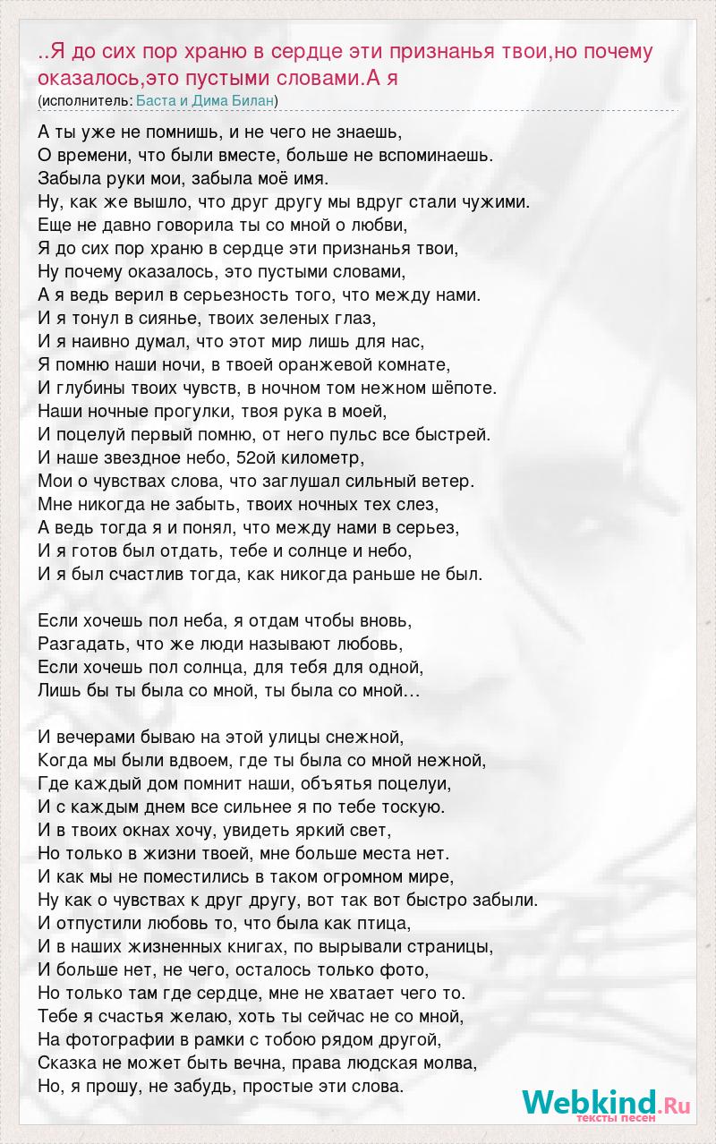 Главная→Исполнители→Баста И Дима Билан→..Я до сих пор храню в сердце эти признанья твои,но почему оказалось,это пус