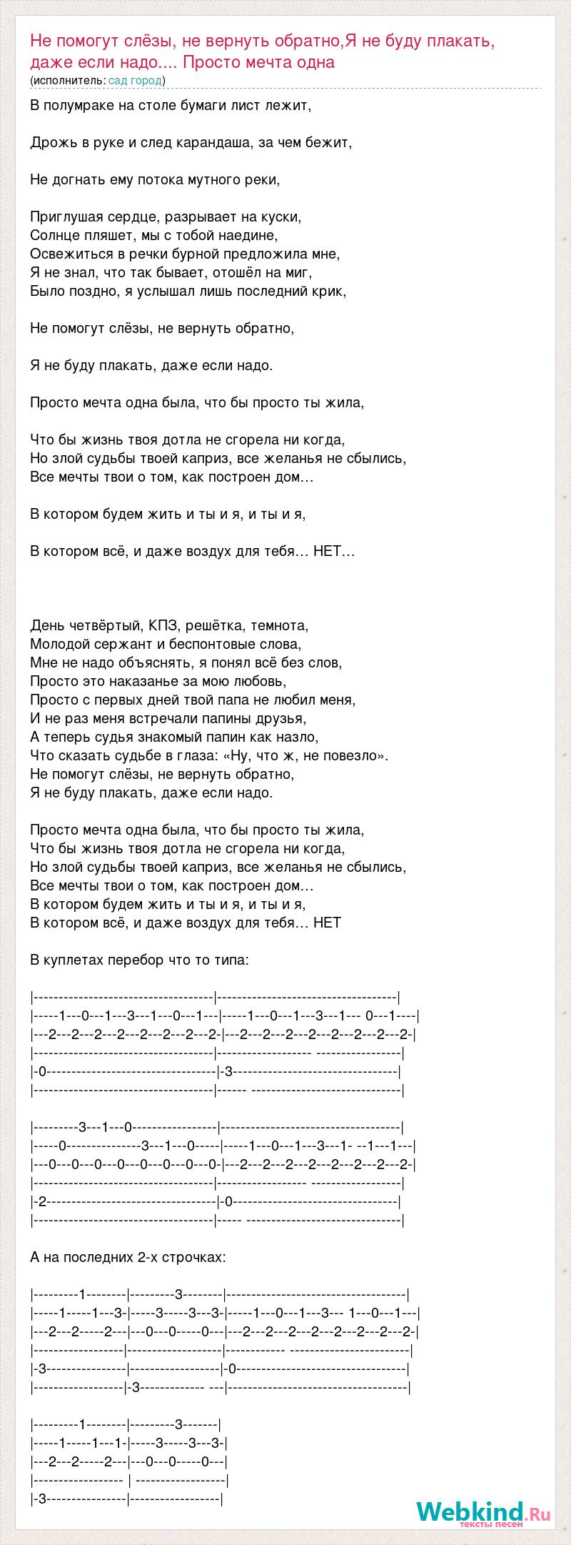 В полумраке на столе бумаги лист лежит, Дрожь в руке и след карандаша, за чем бежит, Не догнать ему потока мутного реки, Приглушая сердце, разрывает на куски, Солнце пляшет, мы с тобой наедине, Освежиться в речки бурной предложила мне, Я не знал, что так бывает, отошёл на миг, Было поздно, я услышал лишь последний крик, Не помогут слёзы, не вернуть обратно, Я не буду плакать, даже если надо. Просто мечта одна была, что бы просто ты жила, Что бы жизнь твоя дотла не сгорела ни когда, Но злой судьбы твоей каприз, все желанья не сбылись, Все мечты твои о том, как построен дом… В котором будем жить и ты и я, и ты и я, В котором всё, и даже воздух для тебя… НЕТ… День четвёртый, КПЗ, решётка, темнота, Молодой сержант и беспонтовые слова, Мне не надо объяснять, я понял всё без слов, Просто это наказанье за мою любовь, Просто с первых дней твой папа не любил меня, И не раз меня встречали папины друзья, А теперь судья знакомый папин как назло, Что сказать судьбе в глаза: «Ну, что ж, не повезло». Не помогут слёзы, не вернуть обратно, Я не буду плакать, даже если надо. Просто мечта одна была, что бы просто ты жила, Что бы жизнь твоя дотла не сгорела ни когда, Но злой судьбы твоей каприз, все желанья не сбылись, Все мечты твои о том, как построен дом… В котором будем жить и ты и я, и ты и я, В котором всё, и даже воздух для тебя… НЕТ В куплетах перебор что то типа: |------------------------------------|------------------------------------| |-----1---0---1---3---1---0---1---|-----1---0---1---3---1--- 0---1----| |---2---2---2---2---2---2---2---2-|---2---2---2---2---2---2---2---2-| |------------------------------------|------------------- -----------------| |-0----------------------------------|-3---------------------------------| |------------------------------------|------ ------------------------------| |---------3---1---0-----------------|------------------------------------| |-----0---------------3---1---0-----|-----1---0---1---3---1- --1---1---| |---0---0---0---0---0---0---0---0-|---2---2---2---2---2---2---2---2-| |------------------------------------|------------------ ------------------| |-2----------------------------------|-0---------------------------------| |------------------------------------|----- -------------------------------| А на последних 2-х строчках: |---------1--------|---------3--------|------------------------------------| |-----1-----1---3-|-----3-----3---3-|-----1---0---1---3--- 1---0---1---| |---2---2-----2---|---0---0-----0---|---2---2---2---2---2---2---2---2-| |------------------|-------------------|------------ ------------------------| |-3----------------|------------------|-0----------------------------------| |------------------|-3------------- ---|------------------------------------| |---------1--------|---------3-------| |-----1-----1---1-|-----3-----3---3-| |---2---2-----2---|---0---0-----0---| |------------------ | ------------------| |-3----------------|------------------|