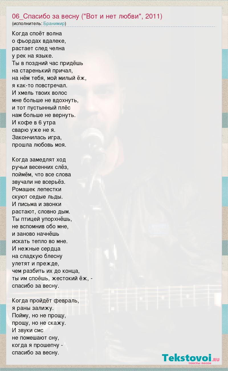 Когда споёт волна о фьордах вдалеке, растает след челна у рек на языке. Ты в поздний час придёшь на старенький причал, на нём тебя, мой милый ёж, я как-то повстречал. И хмель твоих волос мне больше не вдохнуть, и тот пустынный плёс нам больше не вернуть. И кофе в 6 утра сварю уже не я. Закончилась игра, прошла любовь моя. Когда замедлят ход ручьи весенних слёз, поймём, что все слова звучали не всерьёз. Ромашек лепестки скуют седые льды. И письма и звонки растают, словно дым. Ты птицей упорхнёшь, не вспомнив обо мне, и заново начнёшь искать тепло во мне. И нежные сердца на сладкую блесну улетят и прежде, чем разбить их до конца, ты им споёшь, жестокий ёж, - спасибо за весну. Когда пройдёт февраль, я раны залижу. Пойму, но не прощу, прощу, но не скажу. И звуки смс не помешают сну, когда я прошепчу - спасибо за весну.