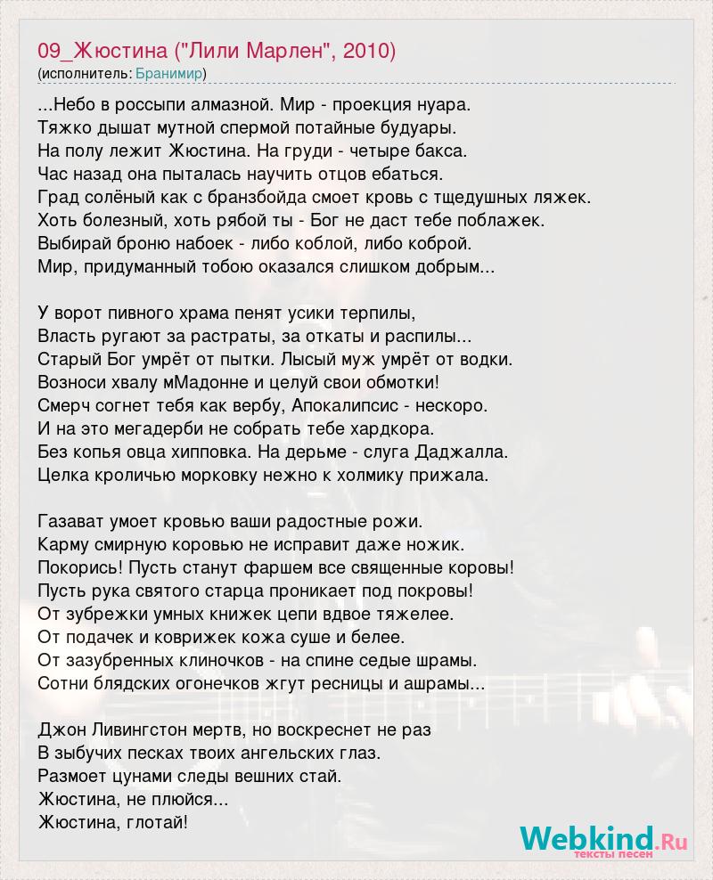 ...Небо в россыпи алмазной. Мир - проекция нуара. Тяжко дышат мутной спермой потайные будуары. На полу лежит Жюстина. На груди - четыре бакса. Час назад она пыталась научить отцов ебаться. Град солёный как с бранзбойда смоет кровь с тщедушных ляжек. Хоть болезный, хоть рябой ты - Бог не даст тебе поблажек. Выбирай броню набоек - либо коблой, либо коброй. Мир, придуманный тобою оказался слишком добрым... У ворот пивного храма пенят усики терпилы, Власть ругают за растраты, за откаты и распилы... Старый Бог умрёт от пытки. Лысый муж умрёт от водки. Возноси хвалу мМадонне и целуй свои обмотки! Смерч согнет тебя как вербу, Апокалипсис - нескоро. И на это мегадерби не собрать тебе хардкора. Без копья овца хипповка. На дерьме - слуга Даджалла. Целка кроличью морковку нежно к холмику прижала. Газават умоет кровью ваши радостные рожи. Карму смирную коровью не исправит даже ножик. Покорись! Пусть станут фаршем все священные коровы! Пусть рука святого старца проникает под покровы! От зубрежки умных книжек цепи вдвое тяжелее. От подачек и коврижек кожа суше и белее. От зазубренных клиночков - на спине седые шрамы. Сотни блядских огонечков жгут ресницы и ашрамы... Джон Ливингстон мертв, но воскреснет не раз В зыбучих песках твоих ангельских глаз. Размоет цунами следы вешних стай. Жюстина, не плюйся... Жюстина, глотай!