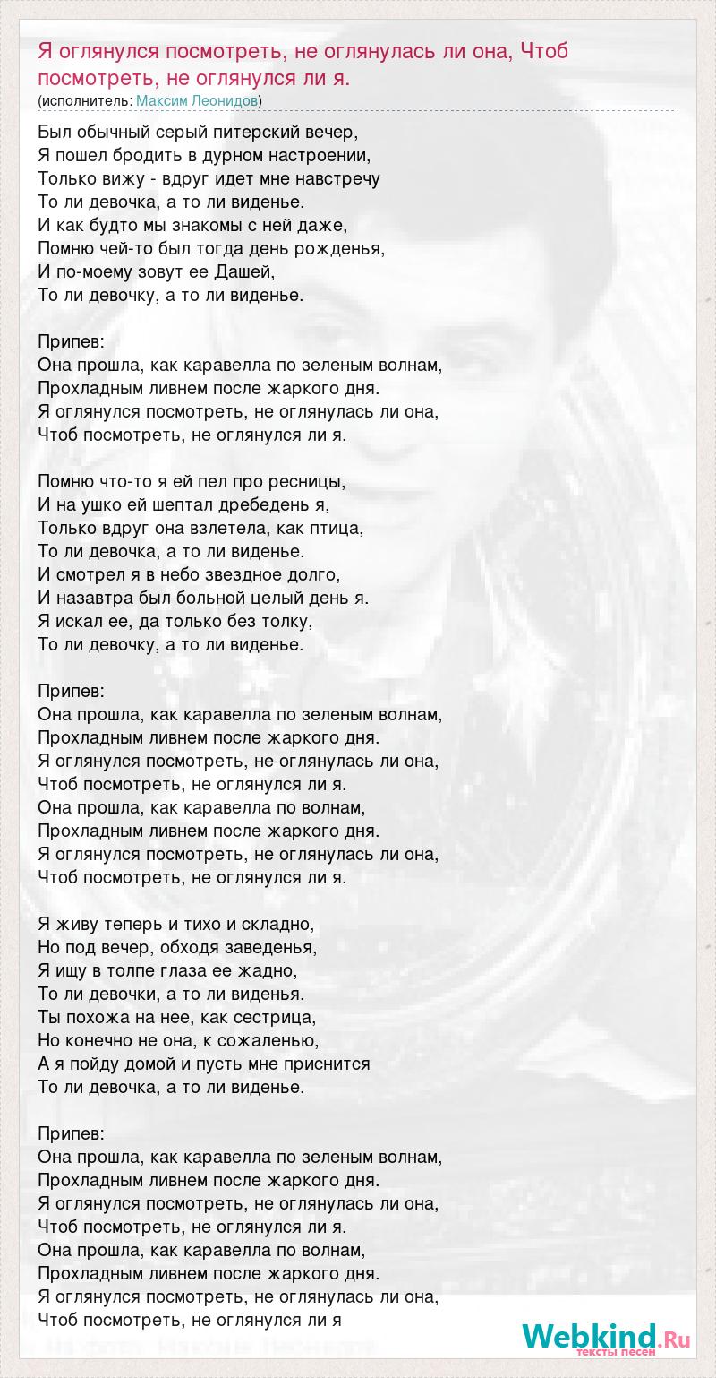 Был обычный серый питерский вечер, Я пошел бродить в дурном настроении, Только вижу - вдруг идет мне навстречу То ли девочка, а то ли виденье. И как будто мы знакомы с ней даже, Помню чей-то был тогда день рожденья, И по-моему зовут ее Дашей, То ли девочку, а то ли виденье. Припев: Она прошла, как каравелла по зеленым волнам, Прохладным ливнем после жаркого дня. Я оглянулся посмотреть, не оглянулась ли она, Чтоб посмотреть, не оглянулся ли я. Помню что-то я ей пел про ресницы, И на ушко ей шептал дребедень я, Только вдруг она взлетела, как птица, То ли девочка, а то ли виденье. И смотрел я в небо звездное долго, И назавтра был больной целый день я. Я искал ее, да только без толку, То ли девочку, а то ли виденье. Припев: Она прошла, как каравелла по зеленым волнам, Прохладным ливнем после жаркого дня. Я оглянулся посмотреть, не оглянулась ли она, Чтоб посмотреть, не оглянулся ли я. Она прошла, как каравелла по волнам, Прохладным ливнем после жаркого дня. Я оглянулся посмотреть, не оглянулась ли она, Чтоб посмотреть, не оглянулся ли я. Я живу теперь и тихо и складно, Но под вечер, обходя заведенья, Я ищу в толпе глаза ее жадно, То ли девочки, а то ли виденья. Ты похожа на нее, как сестрица, Но конечно не она, к сожаленью, А я пойду домой и пусть мне приснится То ли девочка, а то ли виденье. Припев: Она прошла, как каравелла по зеленым волнам, Прохладным ливнем после жаркого дня. Я оглянулся посмотреть, не оглянулась ли она, Чтоб посмотреть, не оглянулся ли я. Она прошла, как каравелла по волнам, Прохладным ливнем после жаркого дня. Я оглянулся посмотреть, не оглянулась ли она, Чтоб посмотреть, не оглянулся ли я