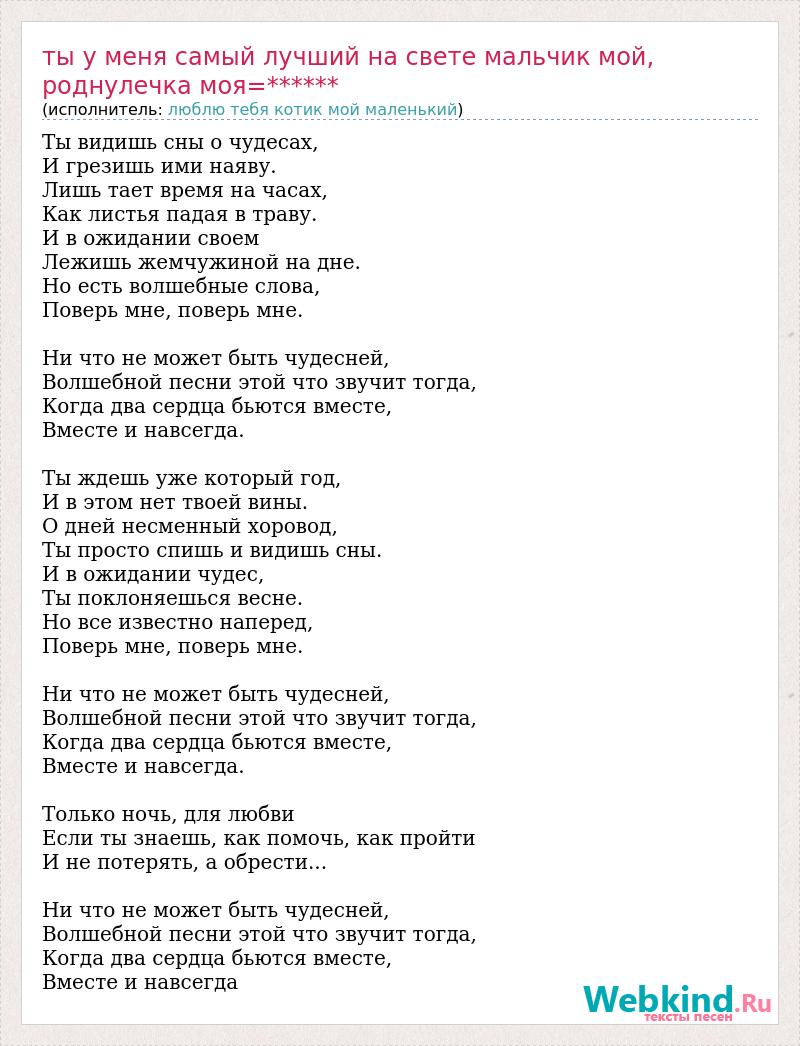 Ты видишь сны о чудесах, И грезишь ими наяву. Лишь тает время на часах, Как листья падая в траву. И в ожидании своем Лежишь жемчужиной на дне. Но есть волшебные слова, Поверь мне, поверь мне. Ни что не может быть чудесней, Волшебной песни этой что звучит тогда, Когда два сердца бьются вместе, Вместе и навсегда. Ты ждешь уже который год, И в этом нет твоей вины. О дней несменный хоровод, Ты просто спишь и видишь сны. И в ожидании чудес, Ты поклоняешься весне. Но все известно наперед, Поверь мне, поверь мне. Ни что не может быть чудесней, Волшебной песни этой что звучит тогда, Когда два сердца бьются вместе, Вместе и навсегда. Только ночь, для любви Если ты знаешь, как помочь, как пройти И не потерять, а обрести... Ни что не может быть чудесней, Волшебной песни этой что звучит тогда, Когда два сердца бьются вместе, Вместе и навсегда