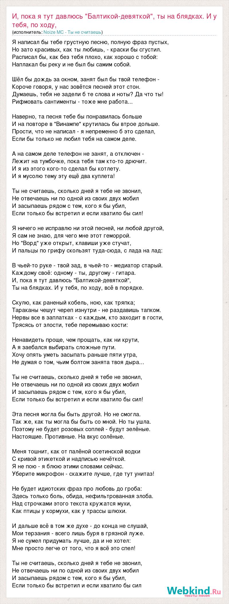 Главная→Исполнители→Noize MC - Ты не считаешь→И, пока я тут давлюсь "Балтикой-девяткой", ты на блядках. И у тебя, по ход