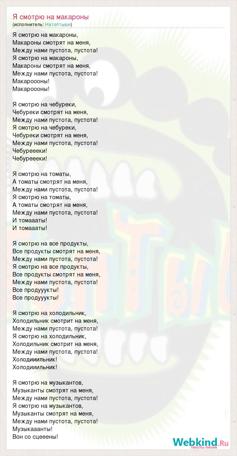 Я смотрю на макароны, Макароны смотрят на меня, Между нами пустота, пустота! Я смотрю на макароны, Макароны смотрят на меня, Между нами пустота, пустота! Макароооны! Макароооны! Я смотрю на чебуреки, Чебуреки смотрят на меня, Между нами пустота, пустота! Я смотрю на чебуреки, Чебуреки смотрят на меня, Между нами пустота, пустота! Чебуреееки! Чебуреееки! Я смотрю на томаты, А томаты смотрят на меня, Между нами пустота, пустота! Я смотрю на томаты, А томаты смотрят на меня, Между нами пустота, пустота! И томаааты! И томаааты! Я смотрю на все продукты, Все продукты смотрят на меня, Между нами пустота, пустота! Я смотрю на все продукты, Все продукты смотрят на меня, Между нами пустота, пустота! Все продууукты! Все продууукты! Я смотрю на холодильник, Холодильник смотрит на меня, Между нами пустота, пустота! Я смотрю на холодильник, Холодильник смотрит на меня, Между нами пустота, пустота! Холодииильник! Холодииильник! Я смотрю на музыкантов, Музыканты смотрят на меня, Между нами пустота, пустота! Я смотрю на музыкантов, Музыканты смотрят на меня, Между нами пустота, пустота! Музыкааанты! Вон со сцееены!