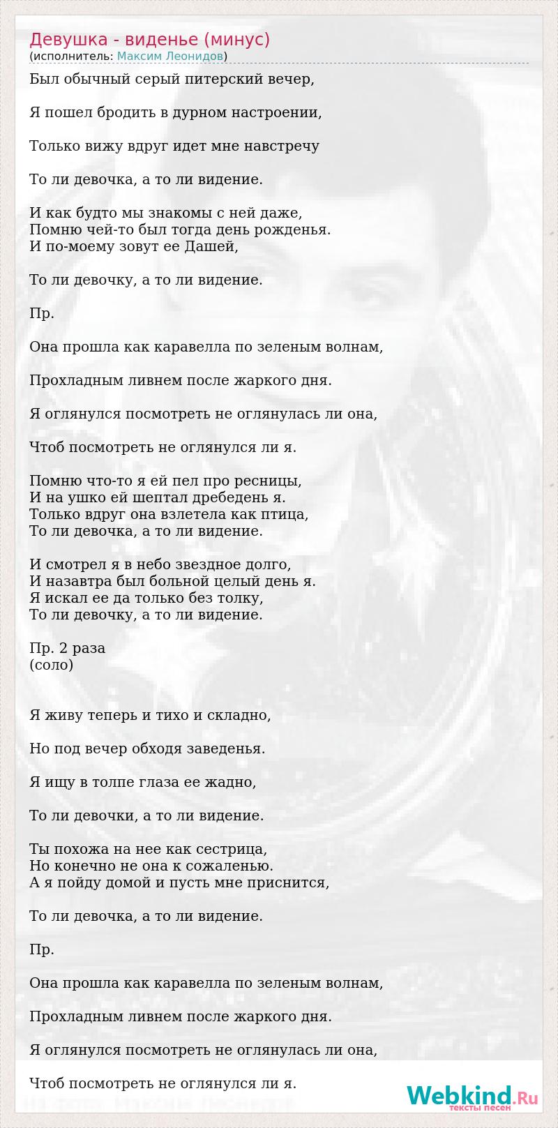 Был обычный серый питерский вечер, Я пошел бродить в дурном настроении, Только вижу вдруг идет мне навстречу То ли девочка, а то ли видение. И как будто мы знакомы с ней даже, Помню чей-то был тогда день рожденья. И по-моему зовут ее Дашей, То ли девочку, а то ли видение. Пр. Она прошла как каравелла по зеленым волнам, Прохладным ливнем после жаркого дня. Я оглянулся посмотреть не оглянулась ли она, Чтоб посмотреть не оглянулся ли я. Помню что-то я ей пел про ресницы, И на ушко ей шептал дребедень я. Только вдруг она взлетела как птица, То ли девочка, а то ли видение. И смотрел я в небо звездное долго, И назавтра был больной целый день я. Я искал ее да только без толку, То ли девочку, а то ли видение. Пр. 2 раза (соло) Я живу теперь и тихо и складно, Но под вечер обходя заведенья. Я ищу в толпе глаза ее жадно, То ли девочки, а то ли видение. Ты похожа на нее как сестрица, Но конечно не она к сожаленью. А я пойду домой и пусть мне приснится, То ли девочка, а то ли видение. Пр. Она прошла как каравелла по зеленым волнам, Прохладным ливнем после жаркого дня. Я оглянулся посмотреть не оглянулась ли она, Чтоб посмотреть не оглянулся ли я.