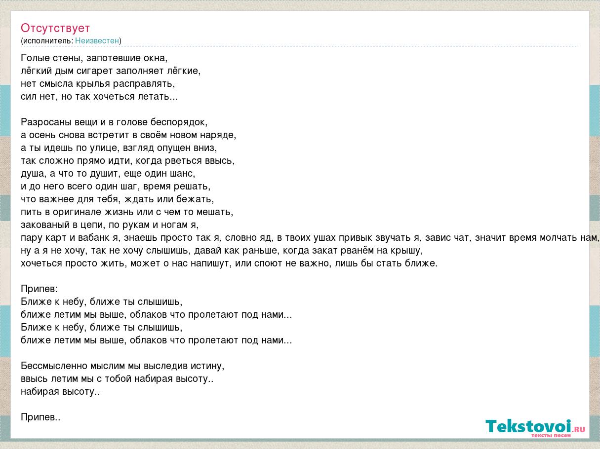 Голые стены, запотевшие окна, лёгкий дым сигарет заполняет лёгкие, нет смысла крылья расправлять, сил нет, но так хочеться летать... Разросаны вещи и в голове беспорядок, а осень снова встретит в своём новом наряде, а ты идешь по улице, взгляд опущен вниз, так сложно прямо идти, когда рветься ввысь, душа, а что то душит, еще один шанс, и до него всего один шаг, время решать, что важнее для тебя, ждать или бежать, пить в оригинале жизнь или с чем то мешать, закованый в цепи, по рукам и ногам я, пару карт и вабанк я, знаешь просто так я, словно яд, в твоих ушах привык звучать я, завис чат, значит время молчать нам, ну а я не хочу, так не хочу слышишь, давай как раньше, когда закат рванём на крышу, хочеться просто жить, может о нас напишут, или споют не важно, лишь бы стать ближе. Припев: Ближе к небу, ближе ты слышишь, ближе летим мы выше, облаков что пролетают под нами... Ближе к небу, ближе ты слышишь, ближе летим мы выше, облаков что пролетают под нами... Бессмысленно мыслим мы выследив истину, ввысь летим мы с тобой набирая высоту.. набирая высоту.. Припев..