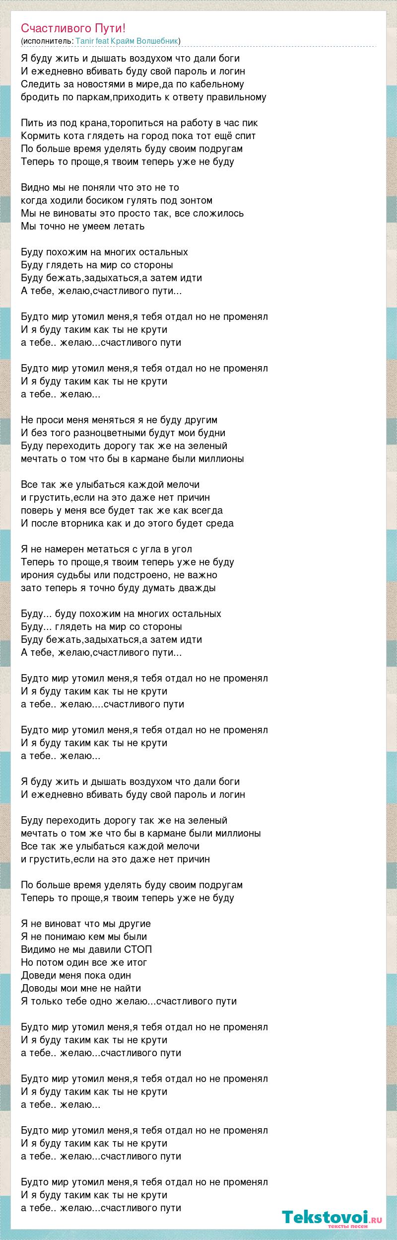 Я буду жить и дышать воздухом что дали боги И ежедневно вбивать буду свой пароль и логин Следить за новостями в мире,да по кабельному бродить по паркам,приходить к ответу правильному Пить из под крана,торопиться на работу в час пик Кормить кота глядеть на город пока тот ещё спит По больше время уделять буду своим подругам Теперь то проще,я твоим теперь уже не буду Видно мы не поняли что это не то когда ходили босиком гулять под зонтом Мы не виноваты это просто так, все сложилось Мы точно не умеем летать Буду похожим на многих остальных Буду глядеть на мир со стороны Буду бежать,задыхаться,а затем идти А тебе, желаю,счастливого пути... Будто мир утомил меня,я тебя отдал но не променял И я буду таким как ты не крути а тебе.. желаю...счастливого пути Будто мир утомил меня,я тебя отдал но не променял И я буду таким как ты не крути а тебе.. желаю... Не проси меня меняться я не буду другим И без того разноцветными будут мои будни Буду переходить дорогу так же на зеленый мечтать о том что бы в кармане были миллионы Все так же улыбаться каждой мелочи и грустить,если на это даже нет причин поверь у меня все будет так же как всегда И после вторника как и до этого будет среда Я не намерен метаться с угла в угол Теперь то проще,я твоим теперь уже не буду ирония судьбы или подстроено, не важно зато теперь я точно буду думать дважды Буду... буду похожим на многих остальных Буду... глядеть на мир со стороны Буду бежать,задыхаться,а затем идти А тебе, желаю,счастливого пути... Будто мир утомил меня,я тебя отдал но не променял И я буду таким как ты не крути а тебе.. желаю....счастливого пути Будто мир утомил меня,я тебя отдал но не променял И я буду таким как ты не крути а тебе.. желаю... Я буду жить и дышать воздухом что дали боги И ежедневно вбивать буду свой пароль и логин Буду переходить дорогу так же на зеленый мечтать о том же что бы в кармане были миллионы Все так же улыбаться каждой мелочи и грустить,если на это даже нет причин По больше время уделять буду своим подругам Теперь то проще,я твоим теперь уже не буду Я не виноват что мы другие Я не понимаю кем мы были Видимо не мы давили СТОП Но потом один все же итог Доведи меня пока один Доводы мои мне не найти Я только тебе одно желаю...счастливого пути Будто мир утомил меня,я тебя отдал но не променял И я буду таким как ты не крути а тебе.. желаю...счастливого пути Будто мир утомил меня,я тебя отдал но не променял И я буду таким как ты не крути а тебе.. желаю... Будто мир утомил меня,я тебя отдал но не променял И я буду таким как ты не крути а тебе.. желаю...счастливого пути Будто мир утомил меня,я тебя отдал но не променял И я буду таким как ты не крути а тебе.. желаю...счастливого пути
