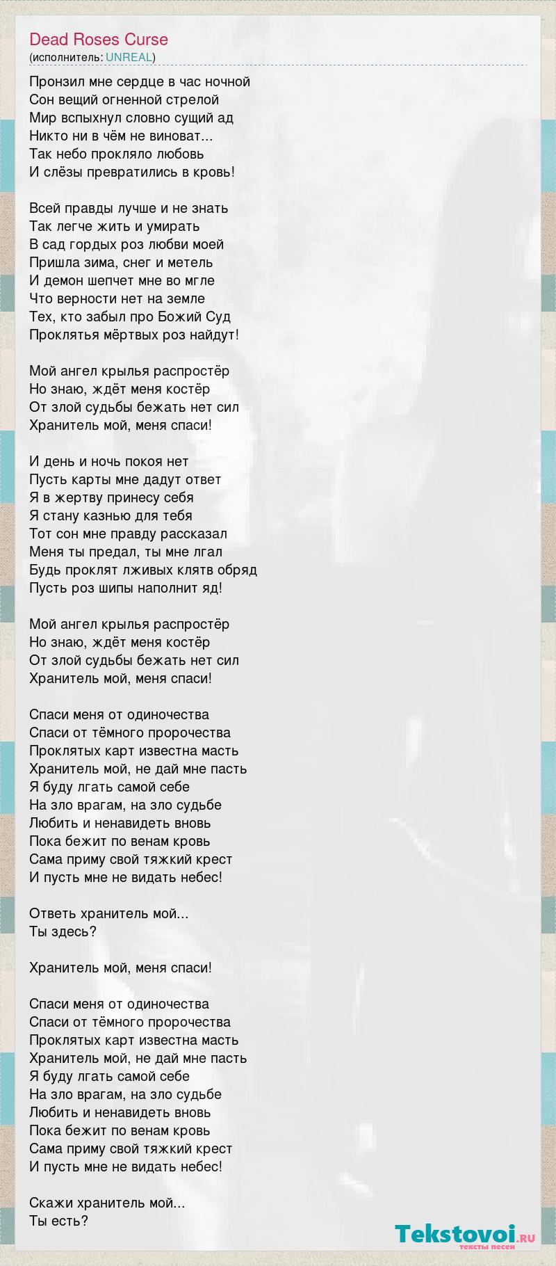 Пронзил мне сердце в час ночной Сон вещий огненной стрелой Мир вспыхнул словно сущий ад Никто ни в чём не виноват... Так небо прокляло любовь И слёзы превратились в кровь! Всей правды лучше и не знать Так легче жить и умирать В сад гордых роз любви моей Пришла зима, снег и метель И демон шепчет мне во мгле Что верности нет на земле Тех, кто забыл про Божий Суд Проклятья мёртвых роз найдут! Мой ангел крылья распростёр Но знаю, ждёт меня костёр От злой судьбы бежать нет сил Хранитель мой, меня спаси! И день и ночь покоя нет Пусть карты мне дадут ответ Я в жертву принесу себя Я стану казнью для тебя Тот сон мне правду рассказал Меня ты предал, ты мне лгал Будь проклят лживых клятв обряд Пусть роз шипы наполнит яд! Мой ангел крылья распростёр Но знаю, ждёт меня костёр От злой судьбы бежать нет сил Хранитель мой, меня спаси! Спаси меня от одиночества Спаси от тёмного пророчества Проклятых карт известна масть Хранитель мой, не дай мне пасть Я буду лгать самой себе На зло врагам, на зло судьбе Любить и ненавидеть вновь Пока бежит по венам кровь Сама приму свой тяжкий крест И пусть мне не видать небес! Ответь хранитель мой... Ты здесь? Хранитель мой, меня спаси! Спаси меня от одиночества Спаси от тёмного пророчества Проклятых карт известна масть Хранитель мой, не дай мне пасть Я буду лгать самой себе На зло врагам, на зло судьбе Любить и ненавидеть вновь Пока бежит по венам кровь Сама приму свой тяжкий крест И пусть мне не видать небес! Скажи хранитель мой... Ты есть?