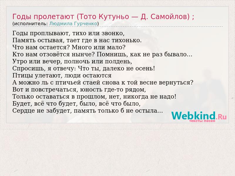 Годы проплывают, тихо или звонко, Память остывая, тает где в нас тихонько. Что нам остается? Много или мало? Кто нам отзовётся нынче? Помнишь, как не раз бывало… Утро или вечер, полночь или полдень, Спросишь, я отвечу: Что ты, далеко не осень! Птицы улетают, люди остаются А можно ль с птичьей стаей снова к той весне вернуться? Вот и повстречаться, юность где-то рядом, Только оставаться в прошлом, нет, никогда не надо! Будет, всё что будет, было, всё что было, Сердце не забудет, память только б не остыла…