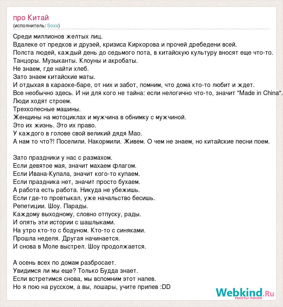 Среди миллионов желтых лиц. Вдалеке от предков и друзей, кризиса Киркорова и прочей дребедени всей. Полста людей, каждый день до седьмого пота, в китайскую культуру вносят еще что-то. Танцоры. Музыканты. Клоуны и акробаты. Не знаем, где найти хлеб. Зато знаем китайские маты. И отдыхая в караоке-баре, от них и забот, помним, что дома кто-то любит и ждет. Все необычно здесь. И ни для кого не тайна: если нелогично что-то, значит "Made in China". Люди ходят строем. Трехколесные машины. Женщины на мотоциклах и мужчина в обнимку с мужчиной. Это их жизнь. Это их право. У каждого в голове свой великий дядя Мао. А нам то что?! Поселили. Накормили. Живем. О чем не знаем, но китайские песни поем. Зато праздники у нас с размахом. Если девятое мая, значит махаем флагом. Если Ивана-Купала, значит кого-то купаем. Если праздника нет, значит просто бухаем. А работа есть работа. Никуда не убежишь. Если где-то провтыкал, уже начальство бесишь. Репетиции. Шоу. Парады. Каждому выходному, словно отпуску, рады. И опять эти истории с шашлыками. На утро кто-то с бодуном. Кто-то с синяками. Прошла неделя. Другая начинается. И снова в Моле выстрел. Шоу продолжается. А осень всех по домам разбросает. Увидимся ли мы еще? Только Будда знает. Если встретимся снова, мы вспомним этот напев. Но я пою на русском, а вы, лошары, учите припев :DD