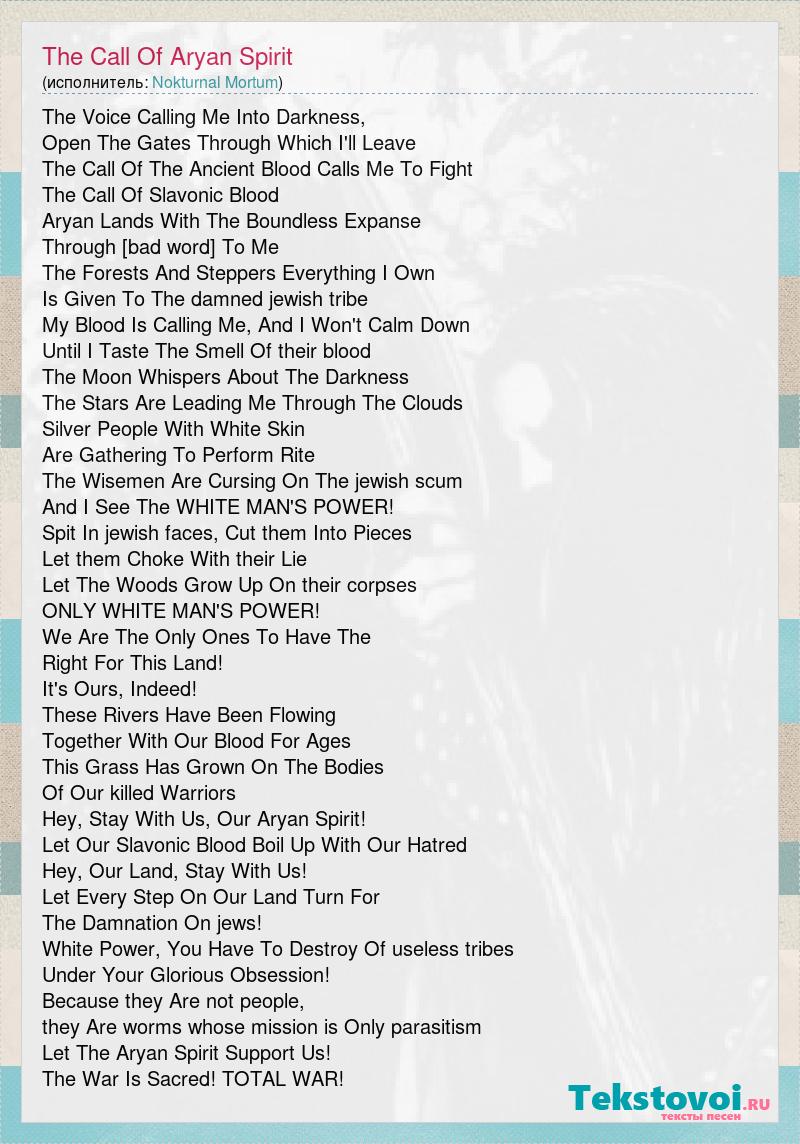 The Voice Calling Me Into Darkness, Open The Gates Through Which I'll Leave The Call Of The Ancient Blood Calls Me To Fight The Call Of Slavonic Blood Aryan Lands With The Boundless Expanse Through [bad word] To Me The Forests And Steppers Everything I Own Is Given To The damned jewish tribe My Blood Is Calling Me, And I Won't Calm Down Until I Taste The Smell Of their blood The Moon Whispers About The Darkness The Stars Are Leading Me Through The Clouds Silver People With White Skin Are Gathering To Perform Rite The Wisemen Are Cursing On The jewish scum And I See The WHITE MAN'S POWER! Spit In jewish faces, Cut them Into Pieces Let them Choke With their Lie Let The Woods Grow Up On their corpses ONLY WHITE MAN'S POWER! We Are The Only Ones To Have The Right For This Land! It's Ours, Indeed! These Rivers Have Been Flowing Together With Our Blood For Ages This Grass Has Grown On The Bodies Of Our killed Warriors Hey, Stay With Us, Our Aryan Spirit! Let Our Slavonic Blood Boil Up With Our Hatred Hey, Our Land, Stay With Us! Let Every Step On Our Land Turn For The Damnation On jews! White Power, You Have To Destroy Of useless tribes Under Your Glorious Obsession! Because they Are not people, they Are worms whose mission is Only parasitism Let The Aryan Spirit Support Us! The War Is Sacred! TOTAL WAR!