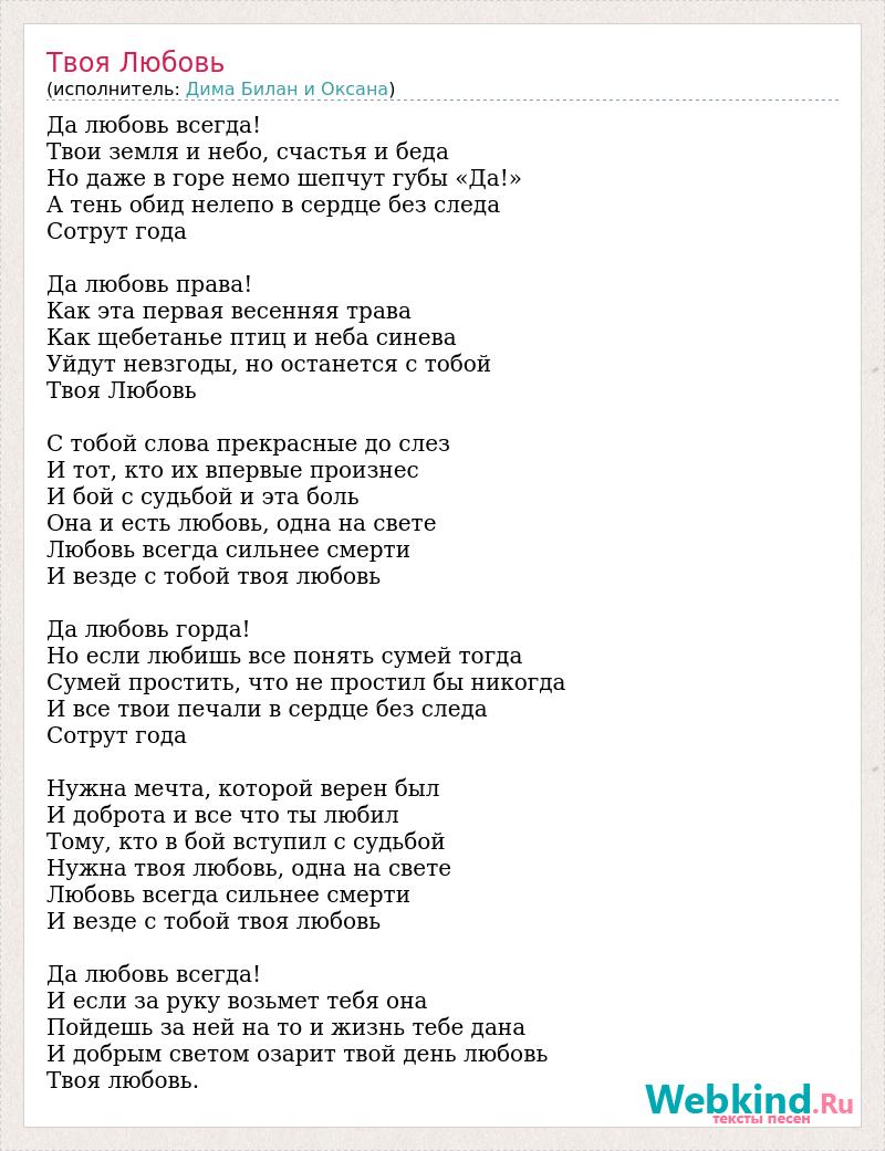 Да любовь всегда! Твои земля и небо, счастья и беда Но даже в горе немо шепчут губы «Да!» А тень обид нелепо в сердце без следа Сотрут года Да любовь права! Как эта первая весенняя трава Как щебетанье птиц и неба синева Уйдут невзгоды, но останется с тобой Твоя Любовь С тобой слова прекрасные до слез И тот, кто их впервые произнес И бой с судьбой и эта боль Она и есть любовь, одна на свете Любовь всегда сильнее смерти И везде с тобой твоя любовь Да любовь горда! Но если любишь все понять сумей тогда Сумей простить, что не простил бы никогда И все твои печали в сердце без следа Сотрут года Нужна мечта, которой верен был И доброта и все что ты любил Тому, кто в бой вступил с судьбой Нужна твоя любовь, одна на свете Любовь всегда сильнее смерти И везде с тобой твоя любовь Да любовь всегда! И если за руку возьмет тебя она Пойдешь за ней на то и жизнь тебе дана И добрым светом озарит твой день любовь Твоя любовь.