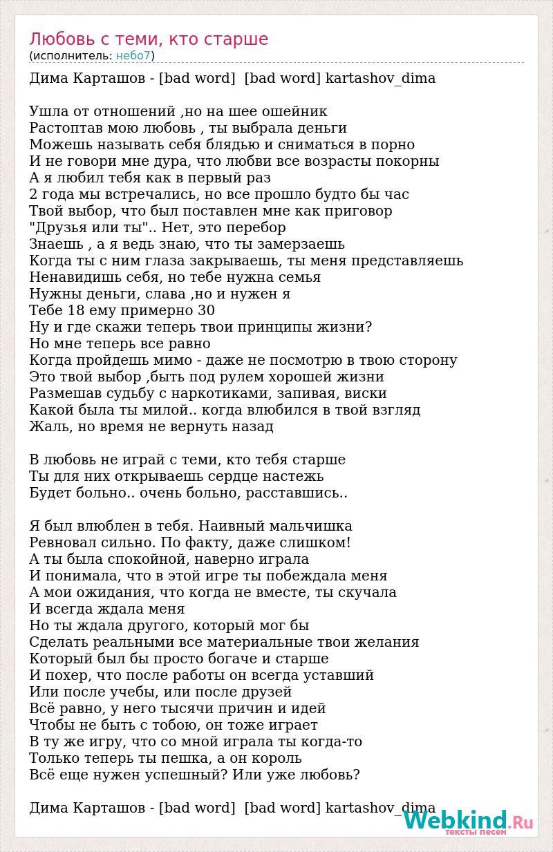 Дима Карташов - [bad word] [bad word] kartashov_dima Ушла от отношений ,но на шее ошейник Растоптав мою любовь , ты выбрала деньги Можешь называть себя блядью и сниматься в порно И не говори мне дура, что любви все возрасты покорны А я любил тебя как в первый раз 2 года мы встречались, но все прошло будто бы час Твой выбор, что был поставлен мне как приговор "Друзья или ты".. Нет, это перебор Знаешь , а я ведь знаю, что ты замерзаешь Когда ты с ним глаза закрываешь, ты меня представляешь Ненавидишь себя, но тебе нужна семья Нужны деньги, слава ,но и нужен я Тебе 18 ему примерно 30 Ну и где скажи теперь твои принципы жизни? Но мне теперь все равно Когда пройдешь мимо - даже не посмотрю в твою сторону Это твой выбор ,быть под рулем хорошей жизни Размешав судьбу с наркотиками, запивая, виски Какой была ты милой.. когда влюбился в твой взгляд Жаль, но время не вернуть назад В любовь не играй с теми, кто тебя старше Ты для них открываешь сердце настежь Будет больно.. очень больно, расставшись.. Я был влюблен в тебя. Наивный мальчишка Ревновал сильно. По факту, даже слишком! А ты была спокойной, наверно играла И понимала, что в этой игре ты побеждала меня А мои ожидания, что когда не вместе, ты скучала И всегда ждала меня Но ты ждала другого, который мог бы Сделать реальными все материальные твои желания Который был бы просто богаче и старше И похер, что после работы он всегда уставший Или после учебы, или после друзей Всё равно, у него тысячи причин и идей Чтобы не быть с тобою, он тоже играет В ту же игру, что со мной играла ты когда-то Только теперь ты пешка, а он король Всё еще нужен успешный? Или уже любовь? Дима Карташов - [bad word] [bad word] kartashov_dima