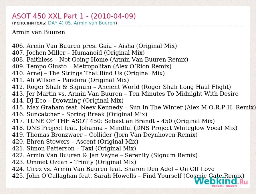 Armin van Buuren 406. Armin Van Buuren pres. Gaia – Aisha (Original Mix) 407. Jochen Miller – Humanoid (Original Mix) 408. Faithless – Not Going Home (Armin Van Buuren Remix) 409. Tempo Giusto – Metropolitan (Alex O’Rion Remix) 410. Arnej – The Strings That Bind Us (Original Mix) 411. Ali Wilson – Pandora (Original Mix) 412. Roger Shah & Signum – Ancient World (Roger Shah Long Haul Flight) 413. Jer Martin vs. Armin Van Buuren – Ten Minutes To Midnight With Desire 414. DJ Eco – Drowning (Original Mix) 415. Max Graham feat. Neev Kennedy – Sun In The Winter (Alex M.O.R.P.H. Remix) 416. Suncatcher – Spring Break (Original Mix) 417. TUNE OF THE ASOT 450: Sebastian Brandt – 450 (Original Mix) 418. DNS Project feat. Johanna – Mindful (DNS Project Whiteglow Vocal Mix) 419. Thomas Bronzwaer – Collider (Jorn Van Deynhoven Remix) 420. Ehren Stowers – Ascent (Original Mix) 421. Simon Patterson – Taxi (Original Mix) 422. Armin Van Buuren & Jan Vayne – Serenity (Signum Remix) 423. Ummet Ozcan – Trinity (Original Mix) 424. Cirez vs. Armin Van Buuren feat. Sharon Den Adel – On Off Love 425. John O’Callaghan feat. Sarah Howells – Find Yourself (Cosmic Gate Remix)