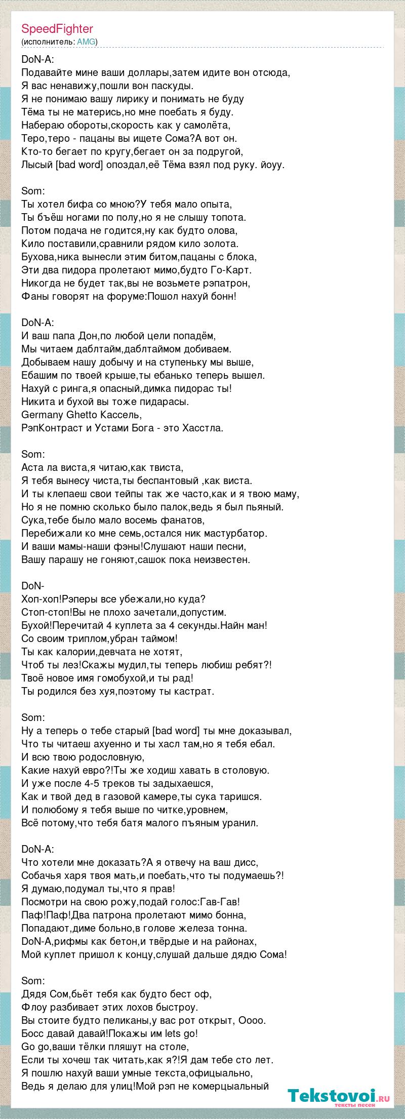 DoN-A: Подавайте мине ваши доллары,затем идите вон отсюда, Я вас ненавижу,пошли вон паскуды. Я не понимаю вашу лирику и понимать не буду Тёма ты не матерись,но мне поебать я буду. Набераю обороты,скорость как у самолёта, Теро,теро - пацаны вы ищете Сома?А вот он. Кто-то бегает по кругу,бегает он за подругой, Лысый [bad word] опоздал,её Тёма взял под руку. йоуу. Som: Ты хотел бифа со мною?У тебя мало опыта, Ты бъёш ногами по полу,но я не слышу топота. Потом подача не годится,ну как будто олова, Кило поставили,сравнили рядом кило золота. Бухова,ника вынесли этим битом,пацаны с блока, Эти два пидора пролетают мимо,будто Го-Карт. Никогда не будет так,вы не возьмете рэпатрон, Фаны говорят на форуме:Пошол нахуй бонн! DoN-A: И ваш папа Дон,по любой цели попадём, Мы читаем даблтайм,даблтаймом добиваем. Добываем нашу добычу и на ступеньку мы выше, Ебашим по твоей крыше,ты ебанько теперь вышел. Нахуй с ринга,я опасный,димка пидорас ты! Никита и бухой вы тоже пидарасы. Germany Ghetto Кассель, РэпКонтраст и Устами Бога - это Хасстла. Som: Аста ла виста,я читаю,как твиста, Я тебя вынесу чиста,ты беспантовый ,как виста. И ты клепаеш свои тейпы так же часто,как и я твою маму, Но я не помню сколько было палок,ведь я был пьяный. Сука,тебе было мало восемь фанатов, Перебижали ко мне семь,остался ник мастурбатор. И ваши мамы-наши фэны!Слушают наши песни, Вашу парашу не гоняют,сашок пока неизвестен. DoN- Хоп-хоп!Рэперы все убежали,но куда? Стоп-стоп!Вы не плохо зачетали,допустим. Бухой!Перечитай 4 куплета за 4 секунды.Найн ман! Со своим триплом,убран таймом! Ты как калории,девчата не хотят, Чтоб ты лез!Скажы мудил,ты теперь любиш ребят?! Твоё новое имя гомобухой,и ты рад! Ты родился без хуя,поэтому ты кастрат. Som: Ну а теперь о тебе старый [bad word] ты мне доказывал, Что ты читаеш ахуенно и ты хасл там,но я тебя ебал. И всю твою родословную, Какие нахуй евро?!Ты же ходиш хавать в столовую. И уже после 4-5 треков ты задыхаешся, Как и твой дед в газовой камере,ты сука таришся. И полюбому я тебя выше по читке,уровнем, Всё потому,что тебя батя малого пъяным уранил. DoN-A: Что хотели мне доказать?А я отвечу на ваш дисс, Собачья харя твоя мать,и поебать,что ты подумаешь?! Я думаю,подумал ты,что я прав! Посмотри на свою рожу,подай голос:Гав-Гав! Паф!Паф!Два патрона пролетают мимо бонна, Попадают,диме больно,в голове железа тонна. DoN-A,рифмы как бетон,и твёрдые и на районах, Мой куплет пришол к концу,слушай дальше дядю Сома! Som: Дядя Сом,бьёт тебя как будто бест оф, Флоу разбивает этих лохов быстроу. Вы стоите будто пеликаны,у вас рот открыт, Оооо. Босс давай давай!Покажы им lets go! Go go,ваши тёлки пляшут на столе, Если ты хочеш так читать,как я?!Я дам тебе сто лет. Я пошлю нахуй ваши умные текста,офицыально, Ведь я делаю для улиц!Мой рэп не комерцыальный