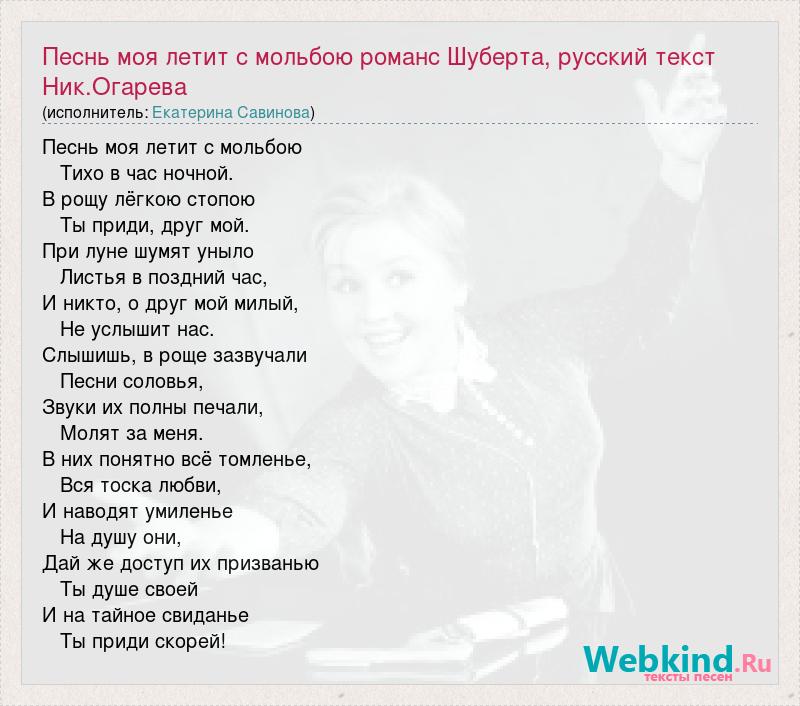 Песнь моя летит с мольбою Тихо в час ночной. В рощу лёгкою стопою Ты приди, друг мой. При луне шумят уныло Листья в поздний час, И никто, о друг мой милый, Не услышит нас. Слышишь, в роще зазвучали Песни соловья, Звуки их полны печали, Молят за меня. В них понятно всё томленье, Вся тоска любви, И наводят умиленье На душу они, Дай же доступ их призванью Ты душе своей И на тайное свиданье Ты приди скорей!
