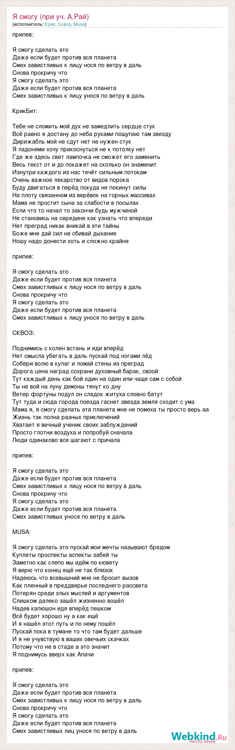 припев: Я смогу сделать это Даже если будет против вся планета Смех завистливых к лицу нося по ветру в даль Снова прокричу что Я смогу сделать это Даже если будет против вся планета Смех завистливых к лицу унося по ветру в даль КрикБит: Тебе не сломить мой дух не замедлить сердце стук Всё равно я достану до неба руками пощупаю там звезду Дирижабль мой не сдут нет не нужен стук Я ладонями хочу прикоснуться не к потолку нет Где же здесь свет лампочка не сможет его заменить Весь текст от и до покажет на сколько он знаменит Изнутри каждого из нас течёт сильным потокам Очень важное лекарство от видов порока Буду двигаться в перёд покуда не покинут силы На плоту связанном из верёвок на горных массивах Мама не простит сына за слабости в посылах Если что то начал то закончи будь мужчиной Не становись на середине как узнать что впереди Нет преград никак вникай в эти тайны Боже мне дай сил не сбивай дыхание Ношу надо донести хоть и сложно крайне припев: Я смогу сделать это Даже если будет против вся планета Смех завистливых к лицу нося по ветру в даль Снова прокричу что Я смогу сделать это Даже если будет против вся планета Смех завистливых к лицу унося по ветру в даль СКВОЗ: Поднимись с колен встань и иди вперёд Нет смысла убегать в даль пускай под ногами лёд Собери волю в кулаг и ломай стены из преград Дорога цена наград сохрани духовный барак, своой Тут каждый день как бой один на один или чаще сам с собой Ты не вой на луну демоны тянут ко дну Ветер фортуны подул он сладок житуха словно батут Тут туда и сюда города поезда гаснет звезда земля сходит с ума Мама я, я смогу сделать эта планета мне не помеха ты просто верь аа Жизнь так полна разных приключений Хватает я вечный ученик своих заблуждений Просто глотни воздуха и попробуй сначала Люди одинаково все шагают с причала припев: Я смогу сделать это Даже если будет против вся планета Смех завистливых к лицу нося по ветру в даль Снова прокричу что Я смогу сделать это Даже если будет против вся планета Смех завистливых унося по ветру в даль MUSA: Я смогу сделать это пускай мои мечты называют бредом Куплеты проспекты аспекты забей ты Заметно как слепо мы идём по кювету Я верю что конец ещё не так близок Надеюсь что всевышний мне не бросит вызов Как пленный в преддверье последнего рассвета Потерян среди злых мыслей и аргументов Слишком далеко зашёл жизненно вошёл Надев капюшон идя вперёд пешком Всё будет хорошо ну а как ещё И я нашёл этот путь и по нему пошёл Пускай пока в тумане то что там будет дальше И я не учувствую в ваших овечьих скачках Потому что не в стаде а это значит Я поднимусь вверх как Апачи припев: Я смогу сделать это Даже если будет против вся планета Смех завистливых к лицу нося по ветру в даль Снова прокричу что Я смогу сделать это Даже если будет против вся планета Смех завистливых лиц унося по ветру в даль