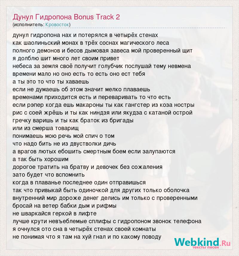 дунул гидропона нах и потерялся в четырёх стенах как шаолиньский монах в трёх соснах магического леса полного демонов и бесов дымовая завеса мой проверенный щит я долблю шит много лет своим привет небеса за земля своё получит голубчик послушай тему невмена времени мало но оно есть то есть оно ест тебя а ты это то что ты хаваешь если не думаешь об этом значит мелко плаваешь временами приходится есть и переваривать то что есть если рэпер когда ешь макароны ты как гангстер из коза ностры рис с соей жрёшь и ты как ниндзя или якудза с катаной острой гречку варишь и ты как браток из бригады или из смерша товарищ понимаешь мою речь мой спич о том что надо бить не из двустволки дичь а врагов лютых ебошить смертным боем если залупаются а так быть хорошим дорогое тратить на братву и девочек без сожаления зато будет что вспомнить когда в плаванье последнее один отправишься так что привыкай быть одиночкой для других только оболочка внутренний мир дороже денег делись им только с проверенными бросай на ветер бабки дым и рифмы не шваркайся геркой в лифте лучше крути невъеблемые сплифы с гидропоном звонок телефона я очнулся ото сна в четырёх стенах своей комнаты не понимая что я там на хуй гнал и по какому поводу