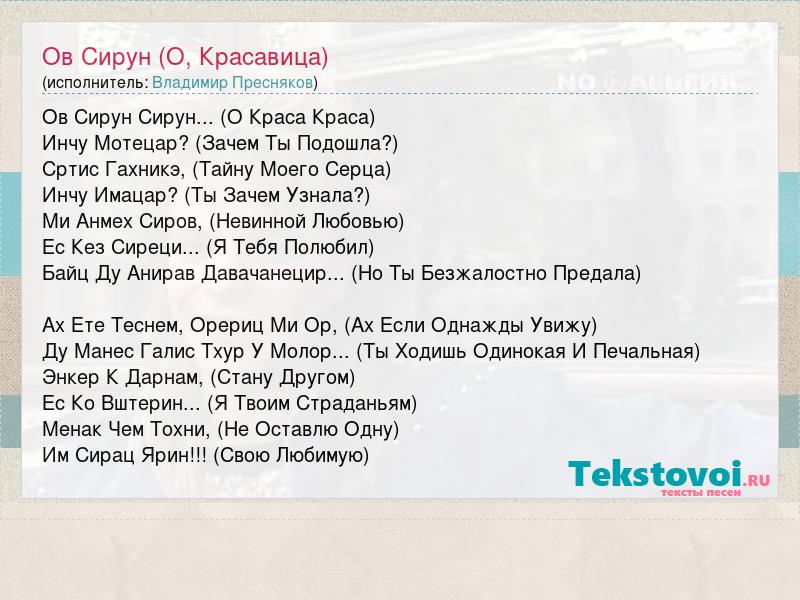 Ов Сирун Сирун... (О Краса Краса) Инчу Мотецар? (Зачем Ты Подошла?) Сртис Гахникэ, (Тайну Моего Серца) Инчу Имацар? (Ты Зачем Узнала?) Ми Анмех Сиров, (Невинной Любовью) Ес Кез Сиреци... (Я Тебя Полюбил) Байц Ду Анирав Давачанецир... (Но Ты Безжалостно Предала) Ах Ете Теснем, Орериц Ми Ор, (Ах Если Однажды Увижу) Ду Манес Галис Тхур У Молор... (Ты Ходишь Одинокая И Печальная) Энкер К Дарнам, (Стану Другом) Ес Ко Вштерин... (Я Твоим Страданьям) Менак Чем Тохни, (Не Оставлю Одну) Им Сирац Ярин!!! (Свою Любимую)