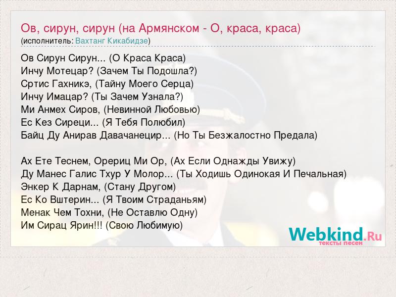 Ов Сирун Сирун... (О Краса Краса) Инчу Мотецар? (Зачем Ты Подошла?) Сртис Гахникэ, (Тайну Моего Серца) Инчу Имацар? (Ты Зачем Узнала?) Ми Анмех Сиров, (Невинной Любовью) Ес Кез Сиреци... (Я Тебя Полюбил) Байц Ду Анирав Давачанецир... (Но Ты Безжалостно Предала) Ах Ете Теснем, Орериц Ми Ор, (Ах Если Однажды Увижу) Ду Манес Галис Тхур У Молор... (Ты Ходишь Одинокая И Печальная) Энкер К Дарнам, (Стану Другом) Ес Ко Вштерин... (Я Твоим Страданьям) Менак Чем Тохни, (Не Оставлю Одну) Им Сирац Ярин!!! (Свою Любимую)
