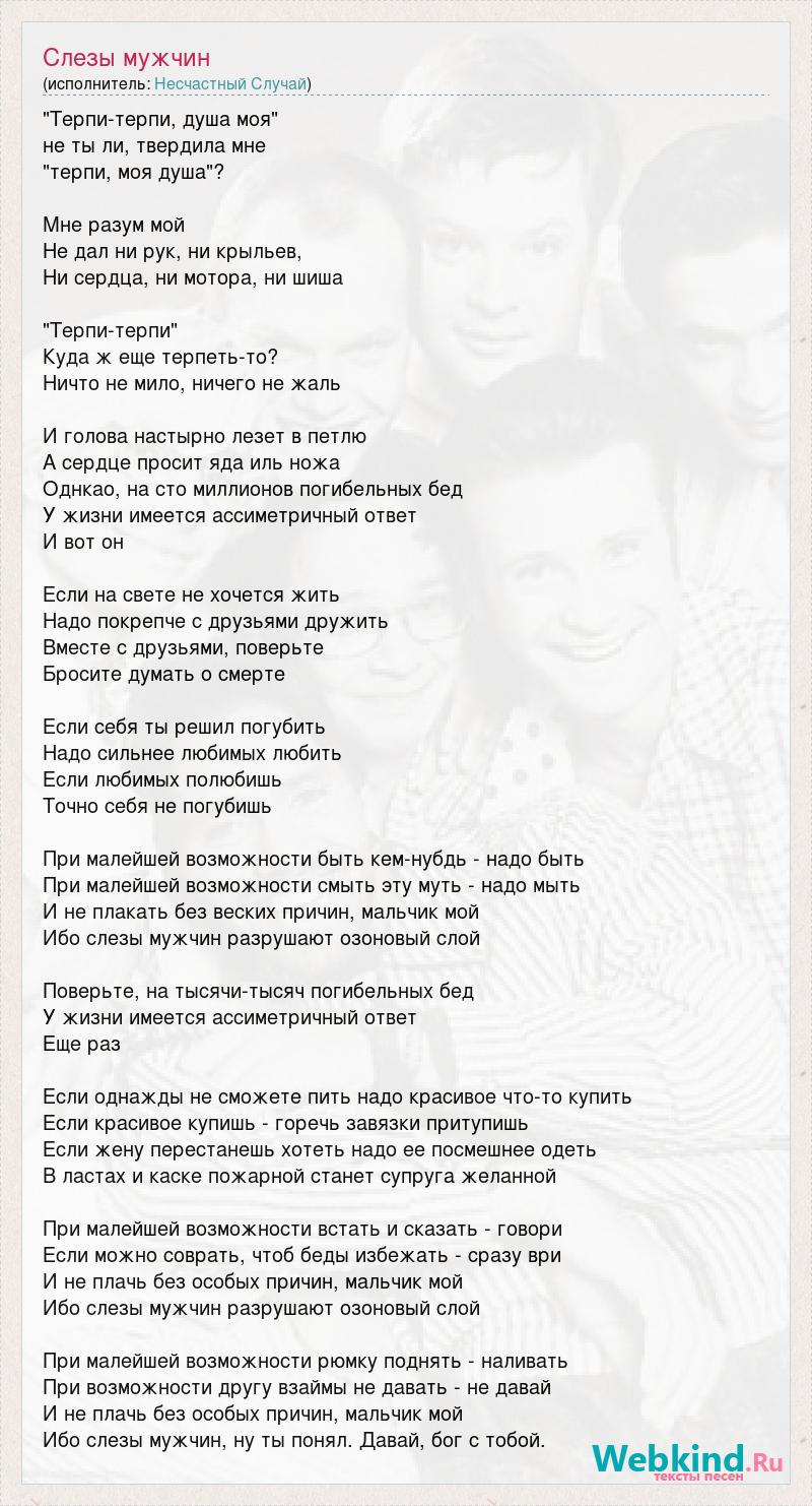 "Терпи-терпи, душа моя" не ты ли, твердила мне "терпи, моя душа"? Мне разум мой Не дал ни рук, ни крыльев, Ни сердца, ни мотора, ни шиша "Терпи-терпи" Куда ж еще терпеть-то? Ничто не мило, ничего не жаль И голова настырно лезет в петлю А сердце просит яда иль ножа Однкао, на сто миллионов погибельных бед У жизни имеется ассиметричный ответ И вот он Если на свете не хочется жить Надо покрепче с друзьями дружить Вместе с друзьями, поверьте Бросите думать о смерте Если себя ты решил погубить Надо сильнее любимых любить Если любимых полюбишь Точно себя не погубишь При малейшей возможности быть кем-нубдь - надо быть При малейшей возможности смыть эту муть - надо мыть И не плакать без веских причин, мальчик мой Ибо слезы мужчин разрушают озоновый слой Поверьте, на тысячи-тысяч погибельных бед У жизни имеется ассиметричный ответ Еще раз Если однажды не сможете пить надо красивое что-то купить Если красивое купишь - горечь завязки притупишь Если жену перестанешь хотеть надо ее посмешнее одеть В ластах и каске пожарной станет супруга желанной При малейшей возможности встать и сказать - говори Если можно соврать, чтоб беды избежать - сразу ври И не плачь без особых причин, мальчик мой Ибо слезы мужчин разрушают озоновый слой При малейшей возможности рюмку поднять - наливать При возможности другу взаймы не давать - не давай И не плачь без особых причин, мальчик мой Ибо слезы мужчин, ну ты понял. Давай, бог с тобой.