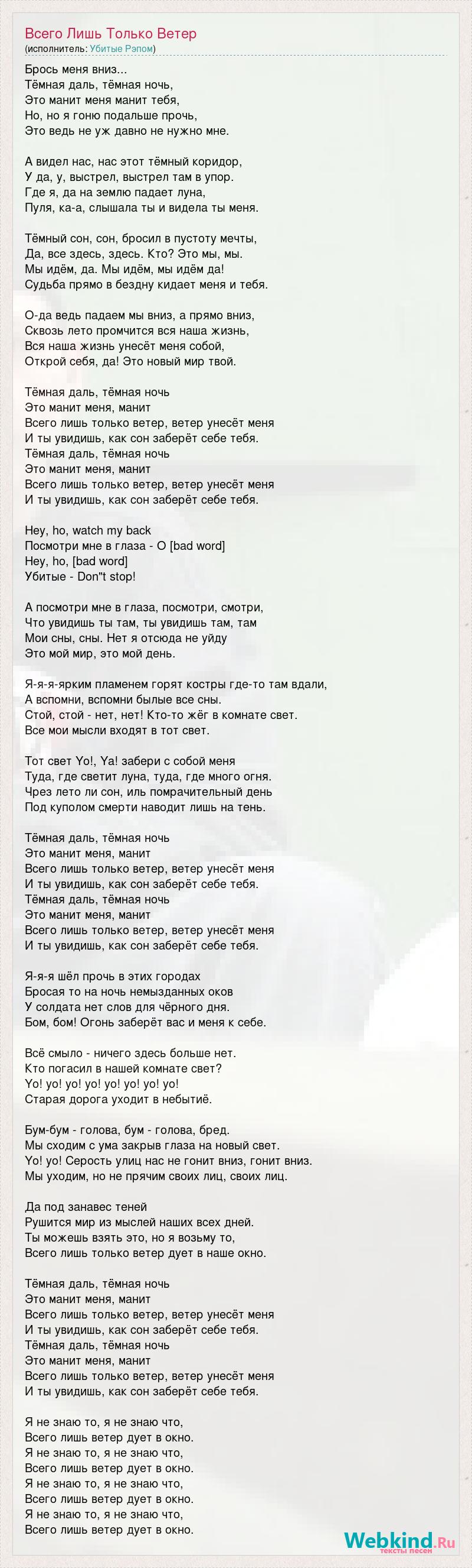 Брось меня вниз... Тёмная даль, тёмная ночь, Это манит меня манит тебя, Но, но я гоню подальше прочь, Это ведь не уж давно не нужно мне. А видел нас, нас этот тёмный коридор, У да, у, выстрел, выстрел там в упор. Где я, да на землю падает луна, Пуля, ка-а, слышала ты и видела ты меня. Тёмный сон, сон, бросил в пустоту мечты, Да, все здесь, здесь. Кто? Это мы, мы. Мы идём, да. Мы идём, мы идём да! Судьба прямо в бездну кидает меня и тебя. О-да ведь падаем мы вниз, а прямо вниз, Сквозь лето промчится вся наша жизнь, Вся наша жизнь унесёт меня собой, Открой себя, да! Это новый мир твой. Тёмная даль, тёмная ночь Это манит меня, манит Всего лишь только ветер, ветер унесёт меня И ты увидишь, как сон заберёт себе тебя. Тёмная даль, тёмная ночь Это манит меня, манит Всего лишь только ветер, ветер унесёт меня И ты увидишь, как сон заберёт себе тебя. Hey, ho, watch my back Посмотри мне в глаза - О [bad word] Hey, ho, [bad word] Убитые - Don"t stop! А посмотри мне в глаза, посмотри, смотри, Что увидишь ты там, ты увидишь там, там Мои сны, сны. Нет я отсюда не уйду Это мой мир, это мой день. Я-я-я-ярким пламенем горят костры где-то там вдали, А вспомни, вспомни былые все сны. Стой, стой - нет, нет! Кто-то жёг в комнате свет. Все мои мысли входят в тот свет. Тот свет Yo!, Ya! забери с собой меня Туда, где светит луна, туда, где много огня. Чрез лето ли сон, иль помрачительный день Под куполом смерти наводит лишь на тень. Тёмная даль, тёмная ночь Это манит меня, манит Всего лишь только ветер, ветер унесёт меня И ты увидишь, как сон заберёт себе тебя. Тёмная даль, тёмная ночь Это манит меня, манит Всего лишь только ветер, ветер унесёт меня И ты увидишь, как сон заберёт себе тебя. Я-я-я шёл прочь в этих городах Бросая то на ночь немызданных оков У солдата нет слов для чёрного дня. Бом, бом! Огонь заберёт вас и меня к себе. Всё смыло - ничего здесь больше нет. Кто погасил в нашей комнате свет? Yo! yo! yo! yo! yo! yo! yo! yo! Старая дорога уходит в небытиё. Бум-бум - голова, бум - голова, бред. Мы сходим с ума закрыв глаза на новый свет. Yo! yo! Серость улиц нас не гонит вниз, гонит вниз. Мы уходим, но не прячим своих лиц, своих лиц. Да под занавес теней Рушится мир из мыслей наших всех дней. Ты можешь взять это, но я возьму то, Всего лишь только ветер дует в наше окно. Тёмная даль, тёмная ночь Это манит меня, манит Всего лишь только ветер, ветер унесёт меня И ты увидишь, как сон заберёт себе тебя. Тёмная даль, тёмная ночь Это манит меня, манит Всего лишь только ветер, ветер унесёт меня И ты увидишь, как сон заберёт себе тебя. Я не знаю то, я не знаю что, Всего лишь ветер дует в окно. Я не знаю то, я не знаю что, Всего лишь ветер дует в окно. Я не знаю то, я не знаю что, Всего лишь ветер дует в окно. Я не знаю то, я не знаю что, Всего лишь ветер дует в окно.