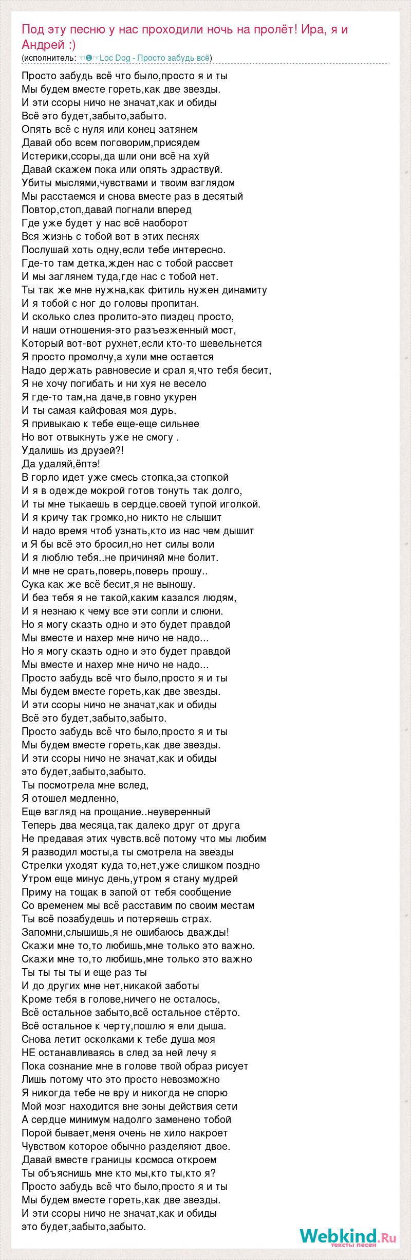Просто забудь всё что было,просто я и ты Мы будем вместе гореть,как две звезды. И эти ссоры ничо не значат,как и обиды Всё это будет,забыто,забыто. Опять всё с нуля или конец затянем Давай обо всем поговорим,присядем Истерики,ссоры,да шли они всё на хуй Давай скажем пока или опять здраствуй. Убиты мыслями,чувствами и твоим взглядом Мы расстаемся и снова вместе раз в десятый Повтор,стоп,давай погнали вперед Где уже будет у нас всё наоборот Вся жизнь с тобой вот в этих песнях Послушай хоть одну,если тебе интересно. Где-то там детка,жден нас с тобой рассвет И мы заглянем туда,где нас с тобой нет. Ты так же мне нужна,как фитиль нужен динамиту И я тобой с ног до головы пропитан. И сколько слез пролито-это пиздец просто, И наши отношения-это разъезженный мост, Который вот-вот рухнет,если кто-то шевельнется Я просто промолчу,а хули мне остается Надо держать равновесие и срал я,что тебя бесит, Я не хочу погибать и ни хуя не весело Я где-то там,на даче,в говно укурен И ты самая кайфовая моя дурь. Я привыкаю к тебе еще-еще сильнее Но вот отвыкнуть уже не смогу . Удалишь из друзей?! Да удаляй,ёптэ! В горло идет уже смесь стопка,за стопкой И я в одежде мокрой готов тонуть так долго, И ты мне тыкаешь в сердце.своей тупой иголкой. И я кричу так громко,но никто не слышит И надо время чтоб узнать,кто из нас чем дышит и Я бы всё это бросил,но нет силы воли И я люблю тебя..не причиняй мне болит. И мне не срать,поверь,поверь прошу.. Сука как же всё бесит,я не выношу. И без тебя я не такой,каким казался людям, И я незнаю к чему все эти сопли и слюни. Но я могу сказть одно и это будет правдой Мы вместе и нахер мне ничо не надо... Но я могу сказть одно и это будет правдой Мы вместе и нахер мне ничо не надо... Просто забудь всё что было,просто я и ты Мы будем вместе гореть,как две звезды. И эти ссоры ничо не значат,как и обиды Всё это будет,забыто,забыто. Просто забудь всё что было,просто я и ты Мы будем вместе гореть,как две звезды. И эти ссоры ничо не значат,как и обиды это будет,забыто,забыто. Ты посмотрела мне вслед, Я отошел медленно, Еще взгляд на прощание..неуверенный Теперь два месяца,так далеко друг от друга Не предавая этих чувств.всё потому что мы любим Я разводил мосты,а ты смотрела на звезды Стрелки уходят куда то,нет,уже слишком поздно Утром еще минус день,утром я стану мудрей Приму на тощак в запой от тебя сообщение Со временем мы всё расставим по своим местам Ты всё позабудешь и потеряешь страх. Запомни,слышишь,я не ошибаюсь дважды! Скажи мне то,то любишь,мне только это важно. Скажи мне то,то любишь,мне только это важно Ты ты ты ты и еще раз ты И до других мне нет,никакой заботы Кроме тебя в голове,ничего не осталось, Всё остальное забыто,всё остальное стёрто. Всё остальное к черту,пошлю я ели дыша. Снова летит осколками к тебе душа моя НЕ останавливаясь в след за ней лечу я Пока сознание мне в голове твой образ рисует Лишь потому что это просто невозможно Я никогда тебе не вру и никогда не спорю Мой мозг находится вне зоны действия сети А сердце минимум надолго заменено тобой Порой бывает,меня очень не хило накроет Чувством которое обычно разделяют двое. Давай вместе границы космоса откроем Ты объяснишь мне кто мы,кто ты,кто я? Просто забудь всё что было,просто я и ты Мы будем вместе гореть,как две звезды. И эти ссоры ничо не значат,как и обиды это будет,забыто,забыто.