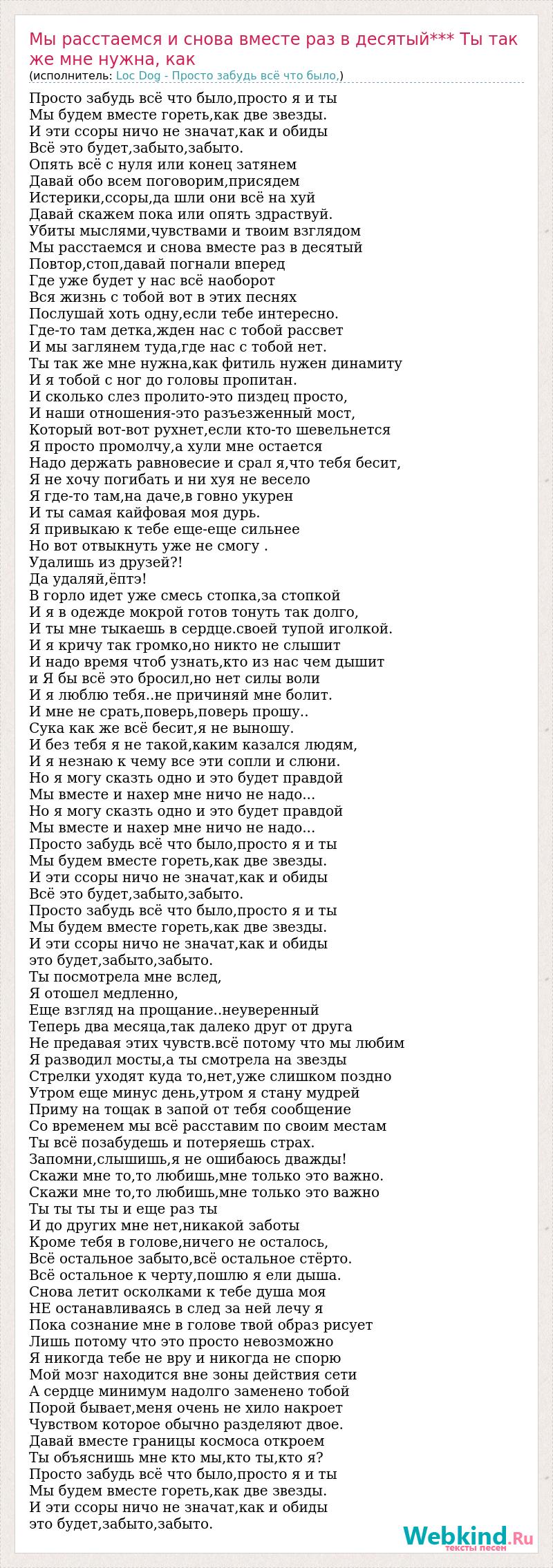 Просто забудь всё что было,просто я и ты Мы будем вместе гореть,как две звезды. И эти ссоры ничо не значат,как и обиды Всё это будет,забыто,забыто. Опять всё с нуля или конец затянем Давай обо всем поговорим,присядем Истерики,ссоры,да шли они всё на хуй Давай скажем пока или опять здраствуй. Убиты мыслями,чувствами и твоим взглядом Мы расстаемся и снова вместе раз в десятый Повтор,стоп,давай погнали вперед Где уже будет у нас всё наоборот Вся жизнь с тобой вот в этих песнях Послушай хоть одну,если тебе интересно. Где-то там детка,жден нас с тобой рассвет И мы заглянем туда,где нас с тобой нет. Ты так же мне нужна,как фитиль нужен динамиту И я тобой с ног до головы пропитан. И сколько слез пролито-это пиздец просто, И наши отношения-это разъезженный мост, Который вот-вот рухнет,если кто-то шевельнется Я просто промолчу,а хули мне остается Надо держать равновесие и срал я,что тебя бесит, Я не хочу погибать и ни хуя не весело Я где-то там,на даче,в говно укурен И ты самая кайфовая моя дурь. Я привыкаю к тебе еще-еще сильнее Но вот отвыкнуть уже не смогу . Удалишь из друзей?! Да удаляй,ёптэ! В горло идет уже смесь стопка,за стопкой И я в одежде мокрой готов тонуть так долго, И ты мне тыкаешь в сердце.своей тупой иголкой. И я кричу так громко,но никто не слышит И надо время чтоб узнать,кто из нас чем дышит и Я бы всё это бросил,но нет силы воли И я люблю тебя..не причиняй мне болит. И мне не срать,поверь,поверь прошу.. Сука как же всё бесит,я не выношу. И без тебя я не такой,каким казался людям, И я незнаю к чему все эти сопли и слюни. Но я могу сказть одно и это будет правдой Мы вместе и нахер мне ничо не надо... Но я могу сказть одно и это будет правдой Мы вместе и нахер мне ничо не надо... Просто забудь всё что было,просто я и ты Мы будем вместе гореть,как две звезды. И эти ссоры ничо не значат,как и обиды Всё это будет,забыто,забыто. Просто забудь всё что было,просто я и ты Мы будем вместе гореть,как две звезды. И эти ссоры ничо не значат,как и обиды это будет,забыто,забыто. Ты посмотрела мне вслед, Я отошел медленно, Еще взгляд на прощание..неуверенный Теперь два месяца,так далеко друг от друга Не предавая этих чувств.всё потому что мы любим Я разводил мосты,а ты смотрела на звезды Стрелки уходят куда то,нет,уже слишком поздно Утром еще минус день,утром я стану мудрей Приму на тощак в запой от тебя сообщение Со временем мы всё расставим по своим местам Ты всё позабудешь и потеряешь страх. Запомни,слышишь,я не ошибаюсь дважды! Скажи мне то,то любишь,мне только это важно. Скажи мне то,то любишь,мне только это важно Ты ты ты ты и еще раз ты И до других мне нет,никакой заботы Кроме тебя в голове,ничего не осталось, Всё остальное забыто,всё остальное стёрто. Всё остальное к черту,пошлю я ели дыша. Снова летит осколками к тебе душа моя НЕ останавливаясь в след за ней лечу я Пока сознание мне в голове твой образ рисует Лишь потому что это просто невозможно Я никогда тебе не вру и никогда не спорю Мой мозг находится вне зоны действия сети А сердце минимум надолго заменено тобой Порой бывает,меня очень не хило накроет Чувством которое обычно разделяют двое. Давай вместе границы космоса откроем Ты объяснишь мне кто мы,кто ты,кто я? Просто забудь всё что было,просто я и ты Мы будем вместе гореть,как две звезды. И эти ссоры ничо не значат,как и обиды это будет,забыто,забыто.