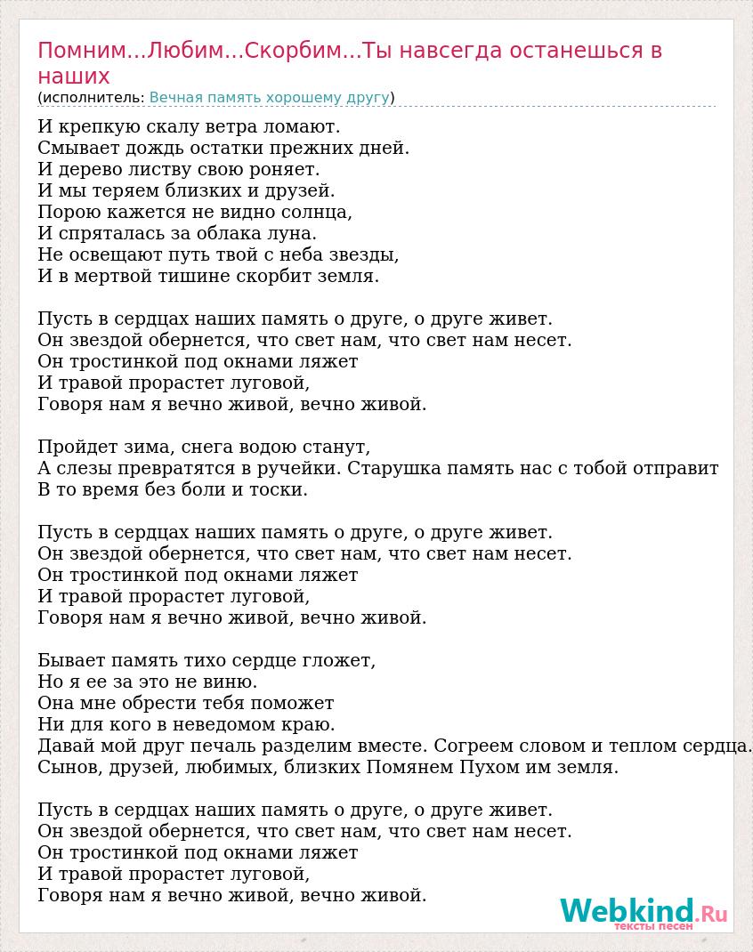 И крепкую скалу ветра ломают. Смывает дождь остатки прежних дней. И дерево листву свою роняет. И мы теряем близких и друзей. Порою кажется не видно солнца, И спряталась за облака луна. Не освещают путь твой с неба звезды, И в мертвой тишине скорбит земля. Пусть в сердцах наших память о друге, о друге живет. Он звездой обернется, что свет нам, что свет нам несет. Он тростинкой под окнами ляжет И травой прорастет луговой, Говоря нам я вечно живой, вечно живой. Пройдет зима, снега водою станут, А слезы превратятся в ручейки. Старушка память нас с тобой отправит В то время без боли и тоски. Пусть в сердцах наших память о друге, о друге живет. Он звездой обернется, что свет нам, что свет нам несет. Он тростинкой под окнами ляжет И травой прорастет луговой, Говоря нам я вечно живой, вечно живой. Бывает память тихо сердце гложет, Но я ее за это не виню. Она мне обрести тебя поможет Ни для кого в неведомом краю. Давай мой друг печаль разделим вместе. Согреем словом и теплом сердца. Сынов, друзей, любимых, близких Помянем Пухом им земля. Пусть в сердцах наших память о друге, о друге живет. Он звездой обернется, что свет нам, что свет нам несет. Он тростинкой под окнами ляжет И травой прорастет луговой, Говоря нам я вечно живой, вечно живой.